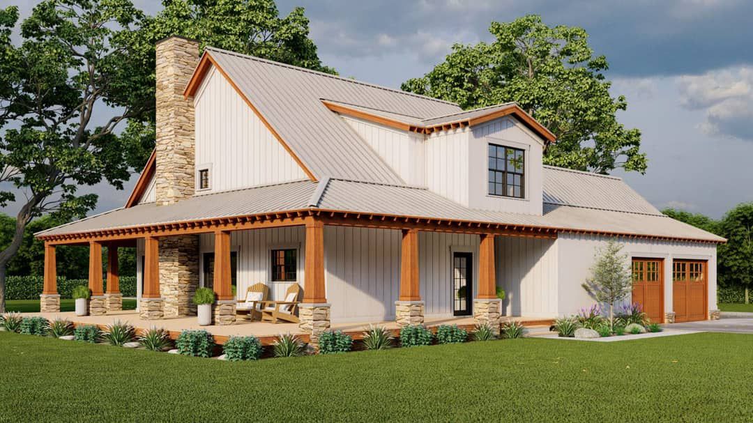 The exterior blends stone and board-and-batten siding, giving the cabin a rugged yet refined presence. The wraparound porch enhances curb appeal and outdoor sustenance. 2 Roof pitches are steep: a primary 10:12 slope and secondary 5:12 slopes maintain a bold, vertical profile. 3