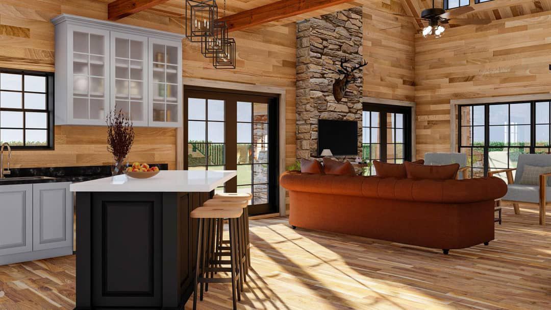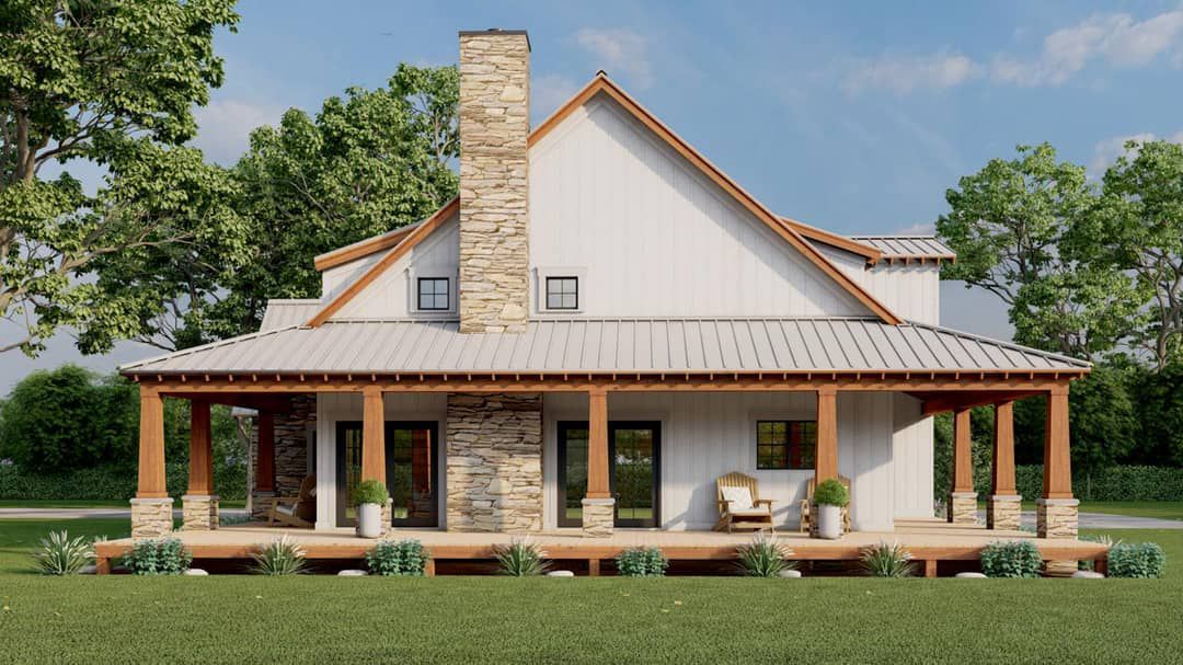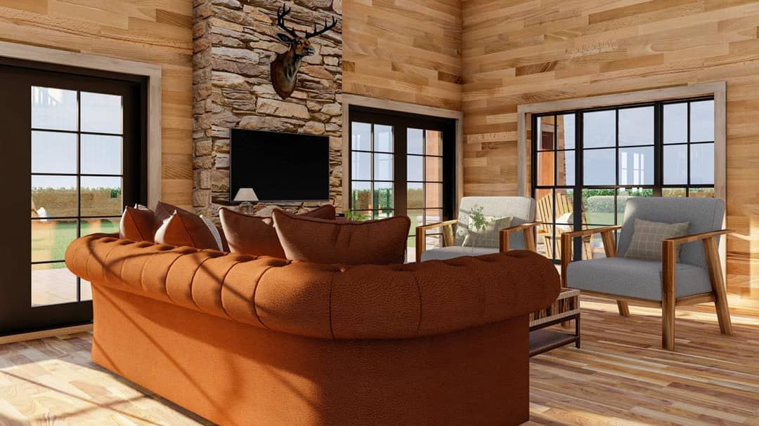 The wraparound porch characterizes the plan, giving covered outdoor spaces on multiple sides. It visually grounds the cabin and gives flexibility for seating, shade, and circulation. 17 The porch, combined with a shed dormer over it, adds light and architectural interest. 18
