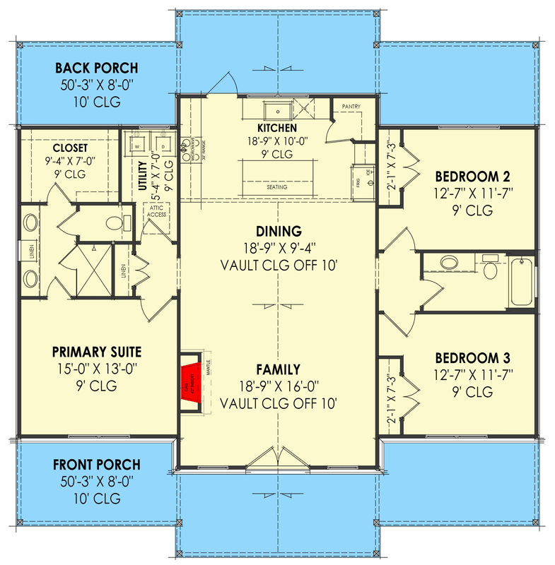 Floor Plan Highlights: The layout follows a split-bedroom format, centering living, dining, and kitchen in a vaulted great room zone. The master and secondary bedrooms are placed on opposite wings for privacy, and generous porches span both façades, extending usable space. 1
