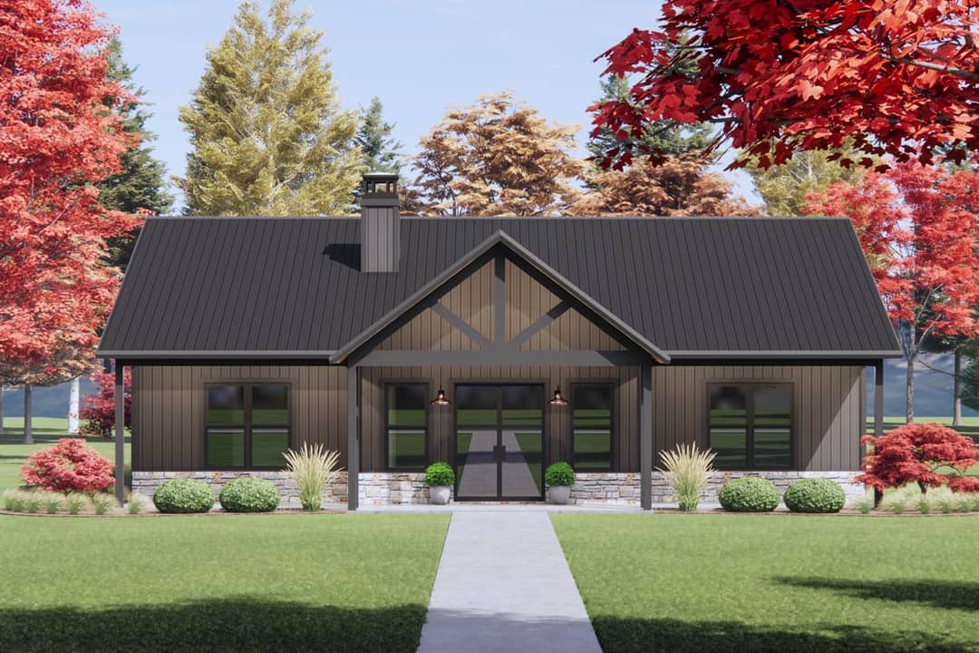 This warm ranch design brings stylish character and practical living together in a footprint of **1,638 sq. ft.** It includes **3 bedrooms**, **2 full bathrooms**, and full-width covered porches on both the front and rear (419 sq. ft. front + 402 sq. ft. rear = 821 sq. ft. of porch). 0