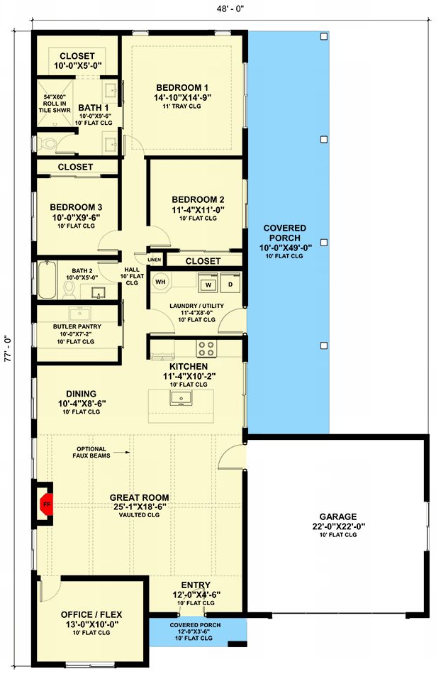 Floor Plan Highlights: The layout centers on a **vaulted great room** with a fireplace, open to the kitchen and dining areas. A flex room—usable as a home office or a guest bedroom—offers added adaptability. From the kitchen and utility space, doors lead out to a **10′ wide covered rear porch** that stretches across much of the rear façade, giving strong indoor/outdoor connection. 1