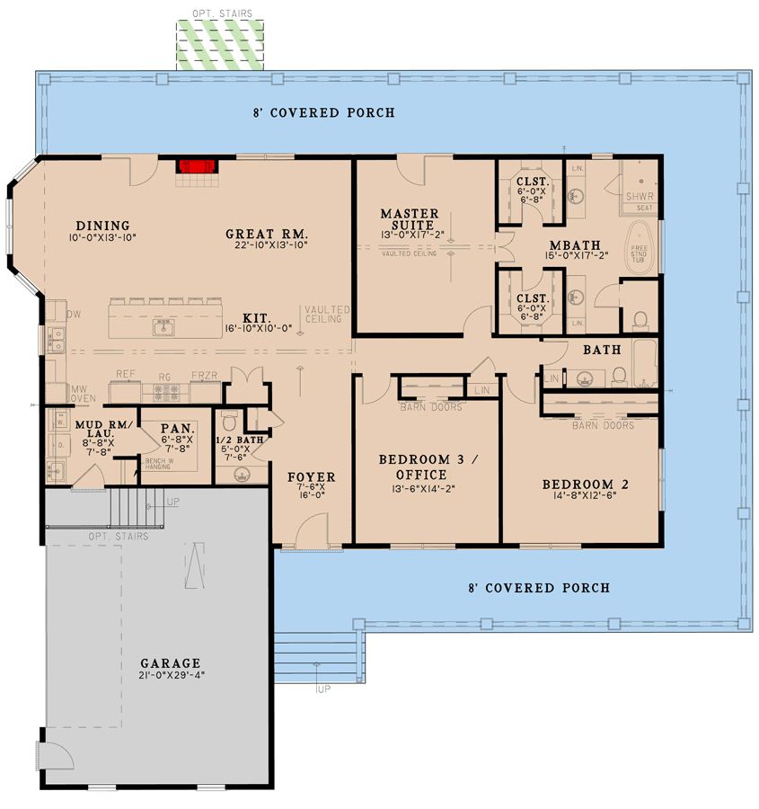 All non-vaulted areas maintain 9′ ceilings for comfortable scale. 20 Vaulted spaces, especially in the great room and master, bring grandeur without overextending structure. 21 Roof framing uses stick construction. 22 The wrap porch is designed with spans manageable relative to the building’s breadth. 23