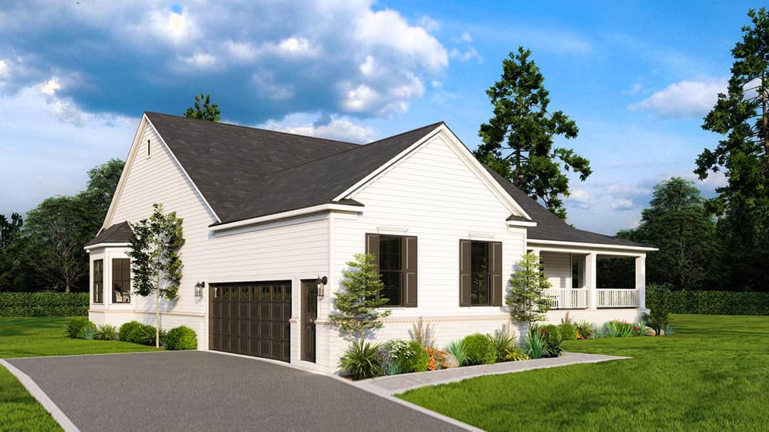 Floor Plan Snapshot: A generous **8′-deep porch wraps the home on three sides**, offering **1,202 sq. ft.** of covered outdoor living. 1 The interior centers on a vaulted great room, connected to kitchen and dining. The master suite includes dual walk-in closets and a five-fixture bath, with direct access to the rear porch. Bedrooms 2 and 3 lie across a hallway; one may serve as a home office. 2