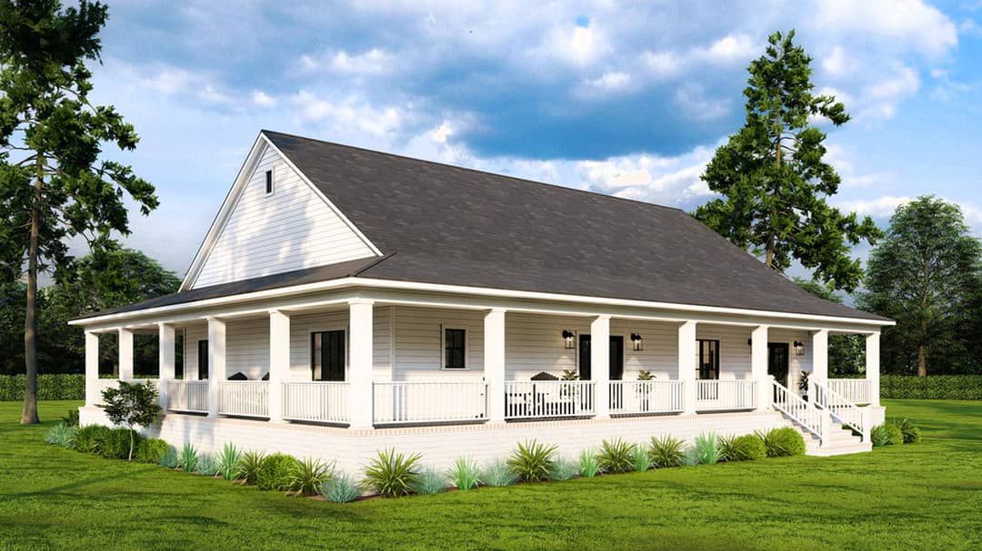 The wrap-around porch—with 1,202 sq. ft. of covered space—essentially becomes an outdoor “room” on all three exposed sides. 15 It anchors views, extends entertaining space, and gives the house a gracious, breathing form. 16