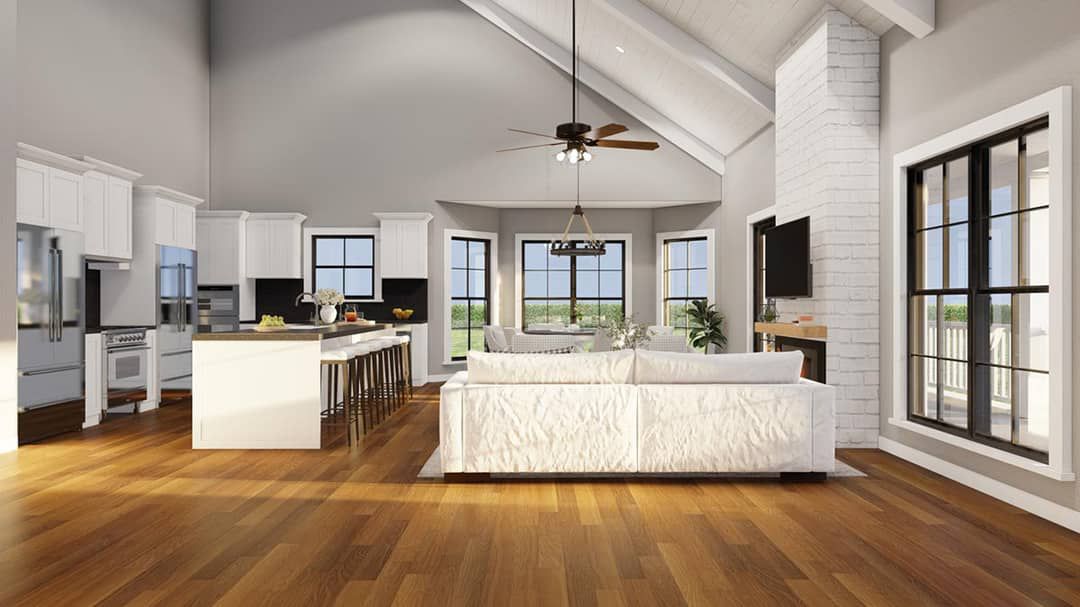 Upon entering, the vaulted great room greets with height and light. The open plan carries you through kitchen, dining, and living in a continuous, luminous space. 7 A fireplace anchors the back wall, flanked by windows, and a door leads directly to the rear porch. 8