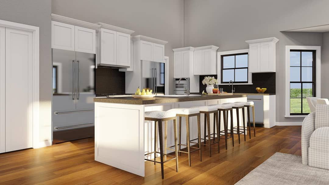The kitchen centers on a long island with sink and seating for six—ideal for entertaining or casual daily use. 9 A butler’s or walk-in pantry supports storage needs without cluttering the main zone. 10