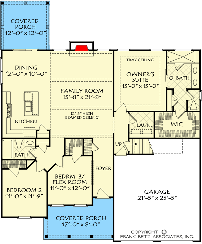 Plumbing and mechanical lines are clustered: the kitchen, owner’s bath, and laundry are located to share wall runs, easing construction and maintenance. 7