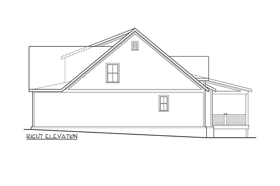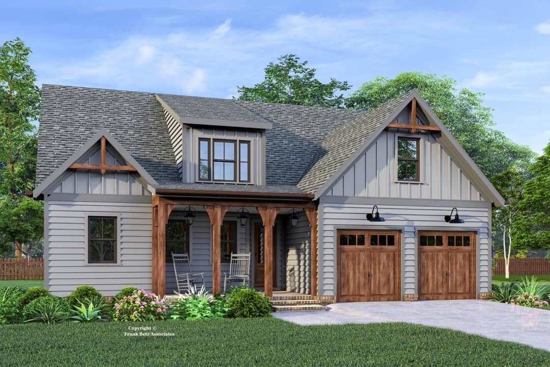 The house carries a modern–farmhouse / New American style with clean siding, simple gables, and modest trim. The roof is pitched at **10:12**, lending vertical presence while retaining manageable framing complexity. 2