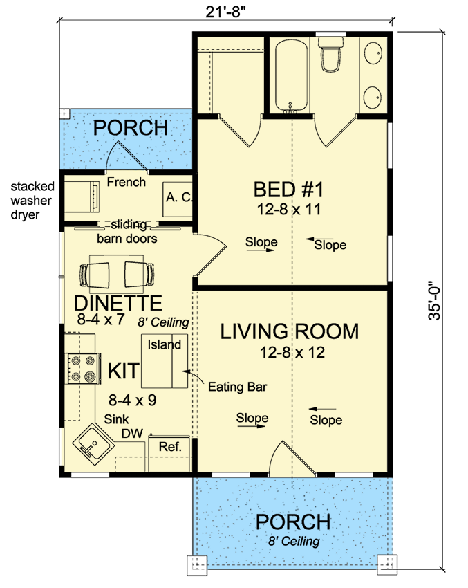 This tiny cottage plan is a testament to doing more with less. You get vaulted living, a full bathroom, modest kitchen, and storage all under 22′ wide. It suits minimalists, guest suites, ADUs, or small-lot builds. If you want something small but complete, this design punches well above its size.