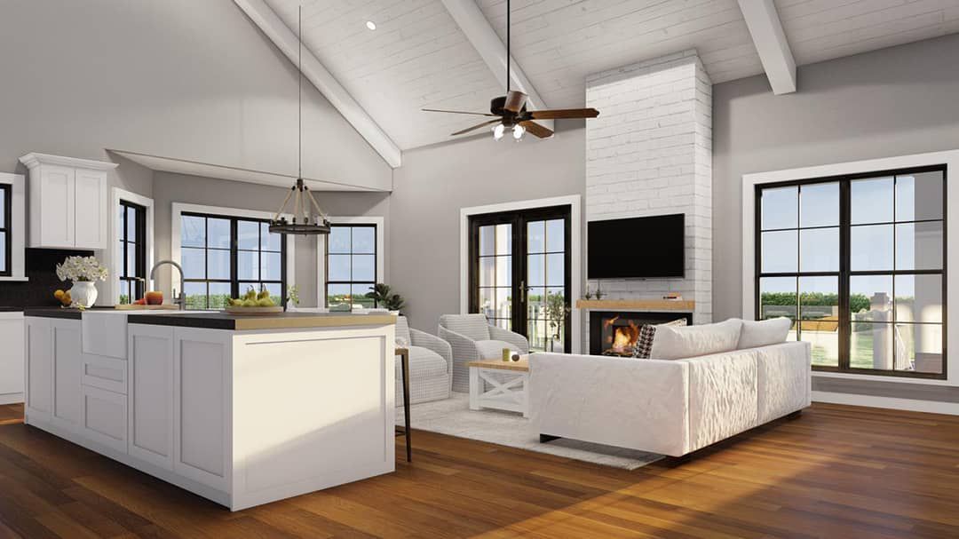 Entering into the open living area, vaulted ceilings lend vertical space. The living and bedroom volumes share the vaulted ceiling treatment to amplify spatial feel. 4The kitchen is tucked into one side with a corner sink positioned between two windows, giving exterior views while you work. 5Circulation is minimal—no long halls. Utility functions (laundry) sit behind sliding barn doors to reduce visual clutter. 6