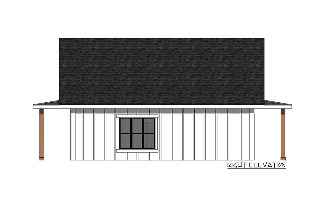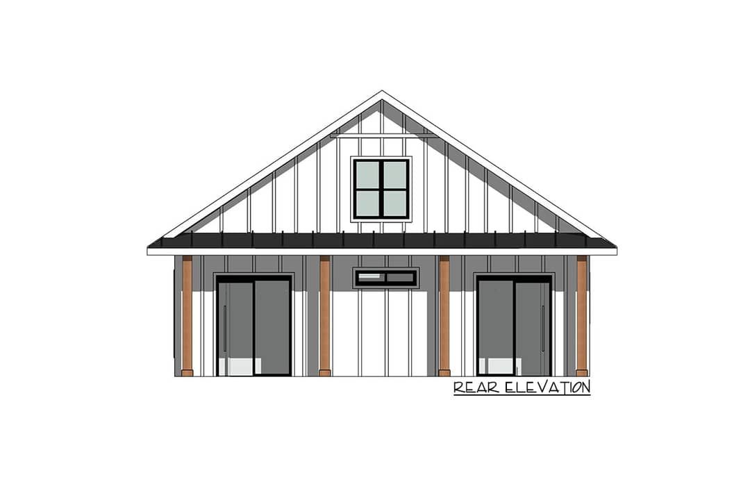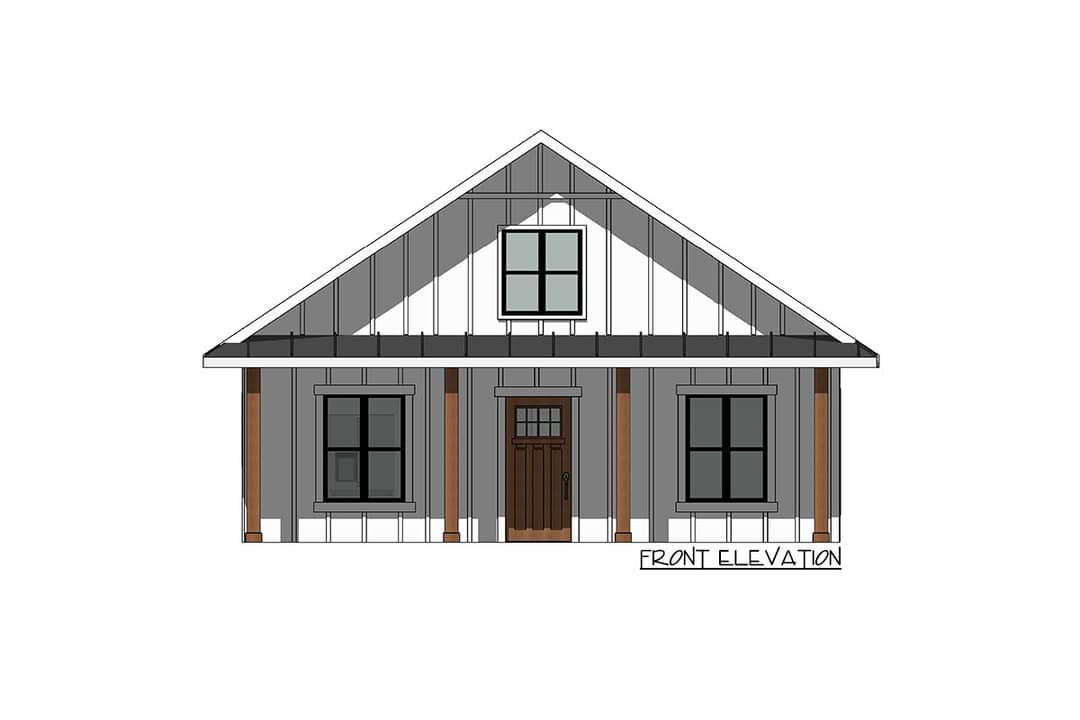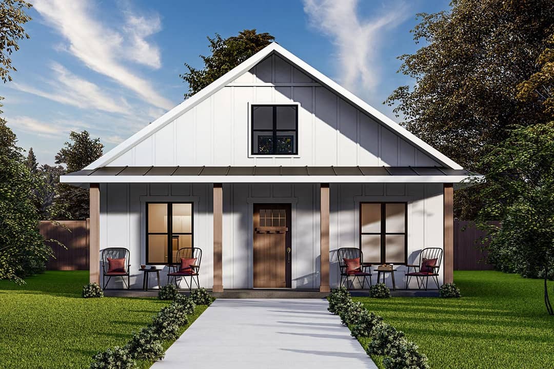 This compact cottage is a masterclass in efficient design. It gives you two bedrooms, a full bath, and sheltered outdoor space on both sides—all in under 800 sq ft. The dual porches frame the home beautifully. The interior leverages vaulted height, minimal circulation, and smart function without feeling cramped. For someone wanting small but complete, this plan offers warm, usable charm with no major compromise.