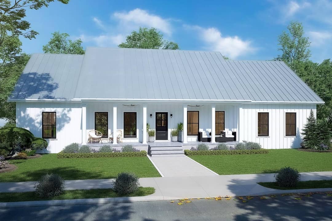 This ranch respects daily rhythms by putting the right rooms in the right places. Groceries glide from garage to kitchen; muddy shoes pause in the mudroom; guests flow naturally between living room, dining table, and the breezy rear porch. It is easy to live in, simple to maintain, and quick to love.