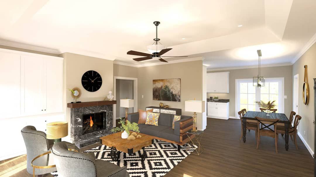 It also favors character over complexity. The architecture is clean and enduring—porches, a fireplace, and layered ceilings add personality without burdening budgets. That balance keeps construction practical today and upkeep manageable for years to come.