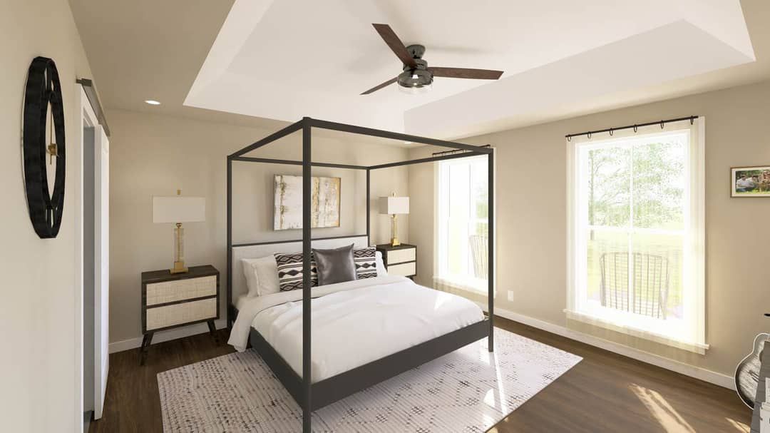The plan uses a split-bedroom arrangement for privacy, placing the primary suite on one side and secondary bedrooms on the other. A welcoming foyer opens into the great room, where views stretch to dining and kitchen zones. Nine-foot ceilings add volume; a tray detail in the living area introduces subtle architectural drama without complicating construction.