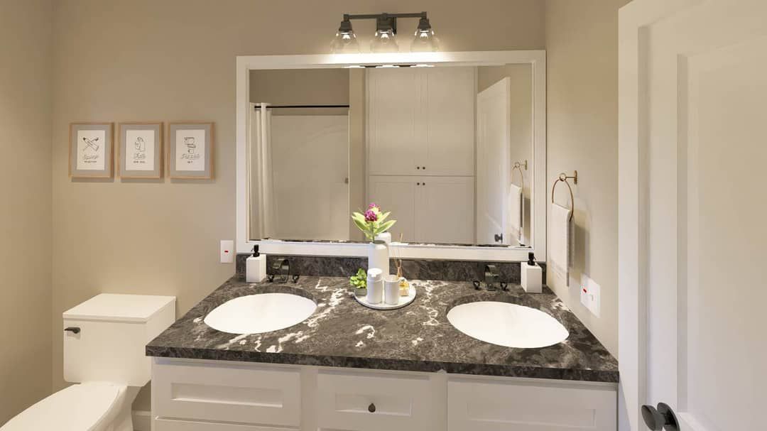 The two secondary bedrooms share a well-sized hall bath with a combination tub/shower and generous linen storage. Each bedroom accommodates a queen bed, side tables, and a desk or dresser without feeling cramped. If you need a dedicated office, one of these rooms converts seamlessly.