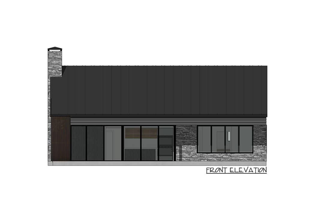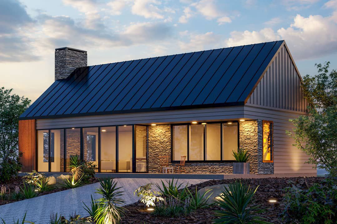 The exterior communicates clean modern lines with rustic touches. The roof combines low slopes and shed forms to manage rain and snow while keeping strong horizontal lines. Large expanses of glass are balanced by solid wall massing, so the glazing doesn’t overwhelm the structure.