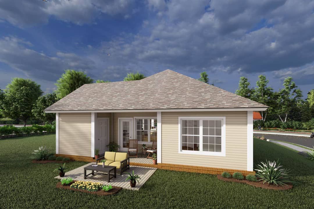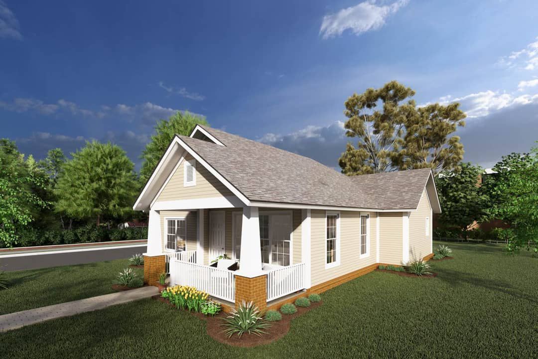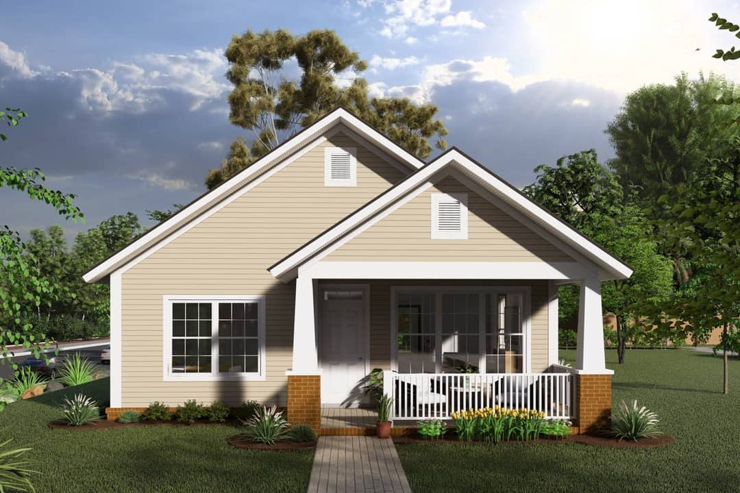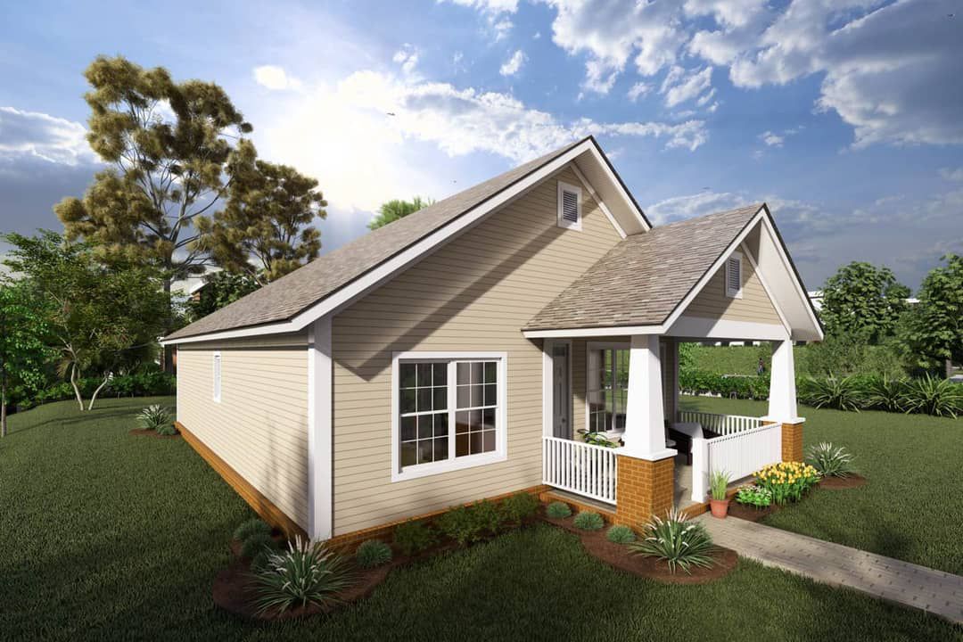 The exterior presents a friendly cottage profile with clean rooflines, balanced window placement, and a welcoming covered entry. Simple trim and proportioned gables give the façade timeless character without complicated detailing. Choose durable cladding such as lap or board-and-batten siding, and consider a touch of stone at the foundation for texture and resilience.