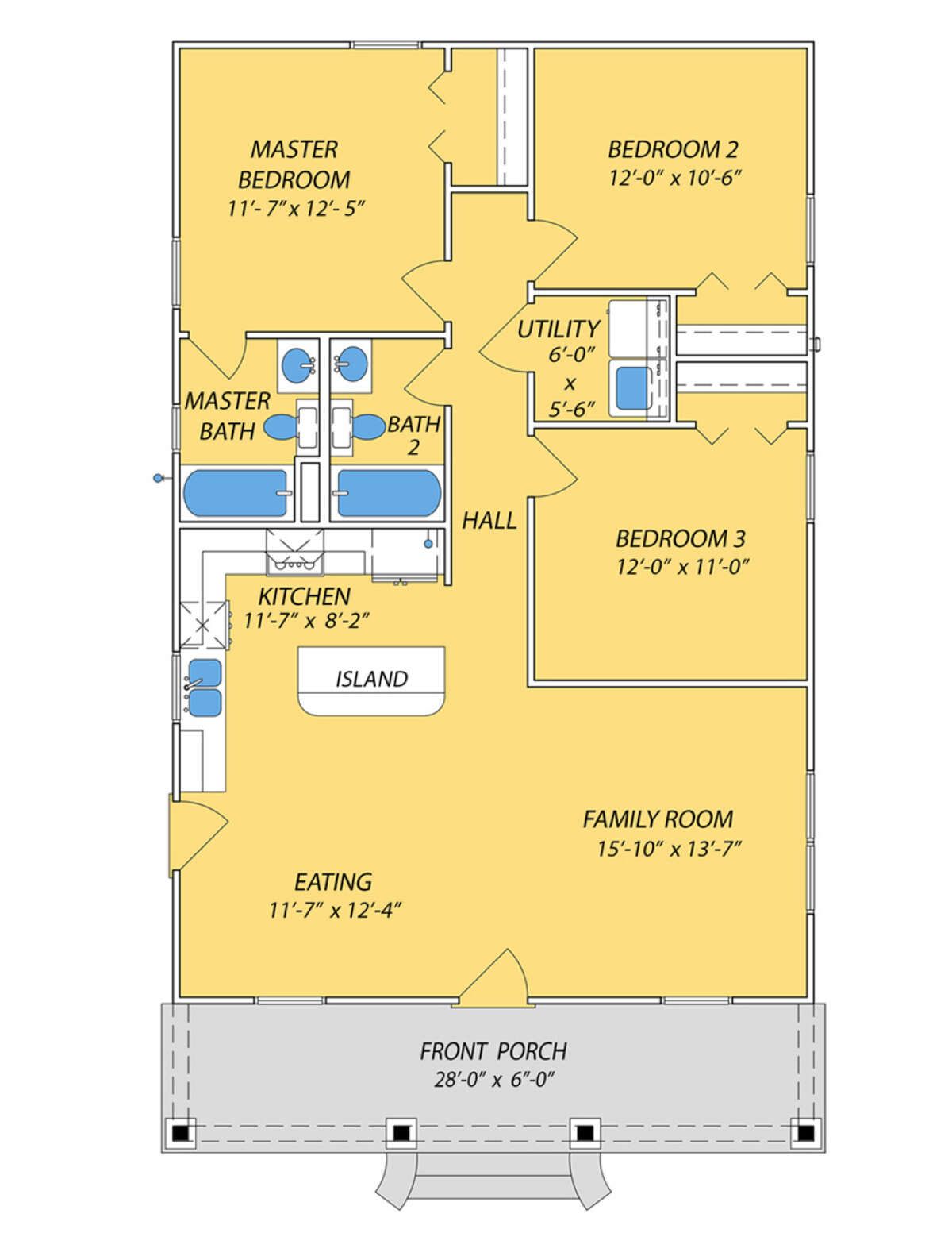 This thoughtfully designed single-story cottage offers 1,176 square feet of living space, blending efficiency with charm. With three bedrooms, two bathrooms, and open-plan living, it’s a home built for practical daily life while maintaining warmth and style. Whether you’re a first-time homeowner, downsizer, or family seeking a right-sized retreat, this design balances comfort with affordability.