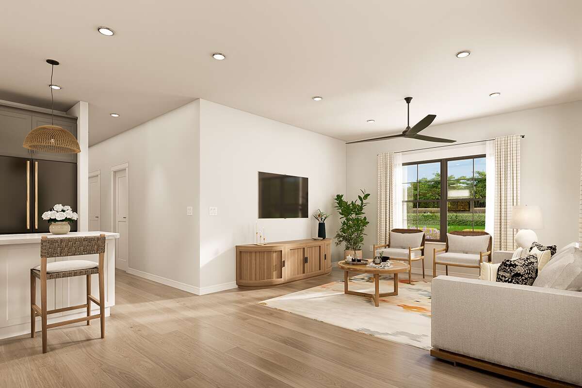 The great room serves as the heart of the home, easily accommodating a sofa, chairs, and media wall. Traffic routes hug the edges of the room, so furniture arrangements remain natural and uncluttered. It’s a space designed for relaxation, conversation, and connection.