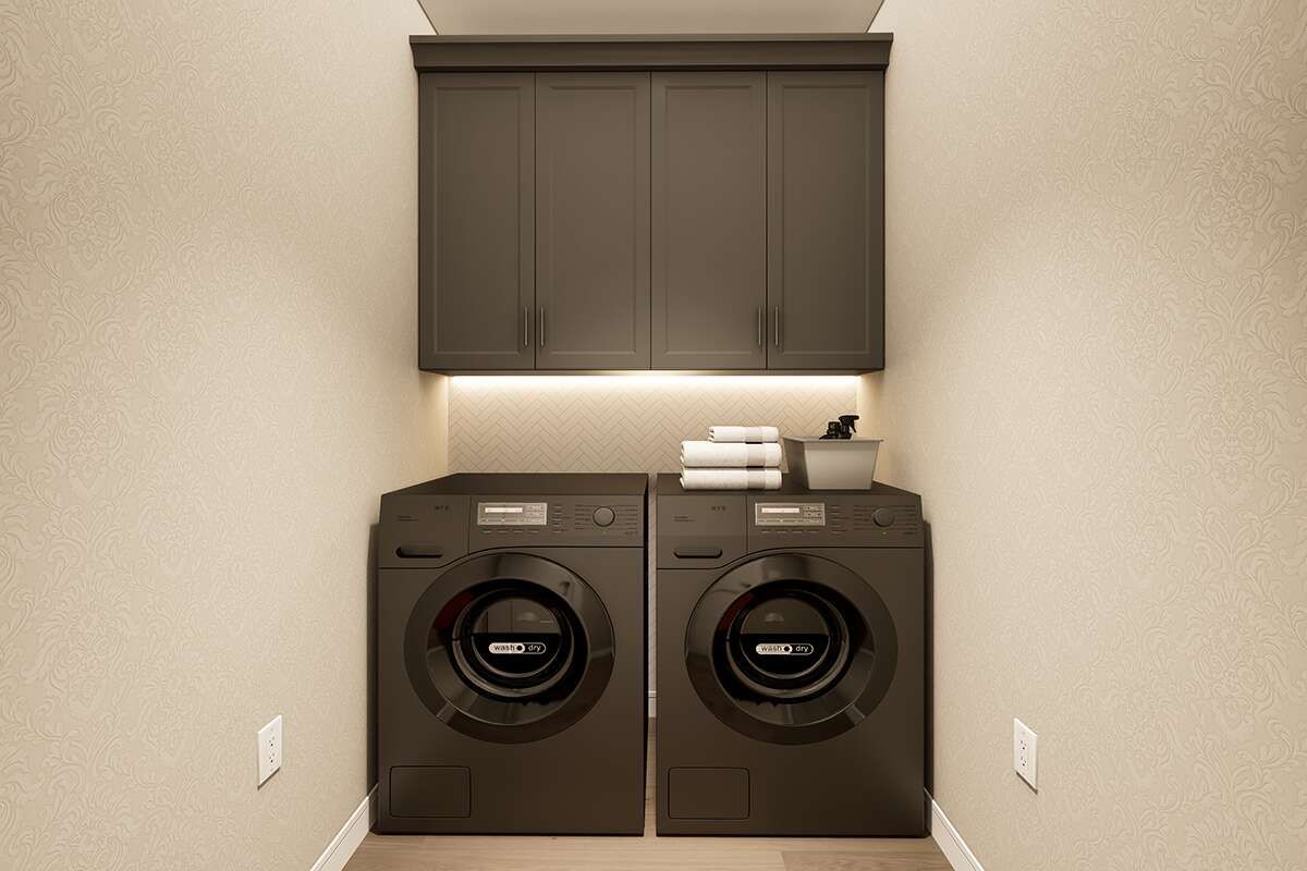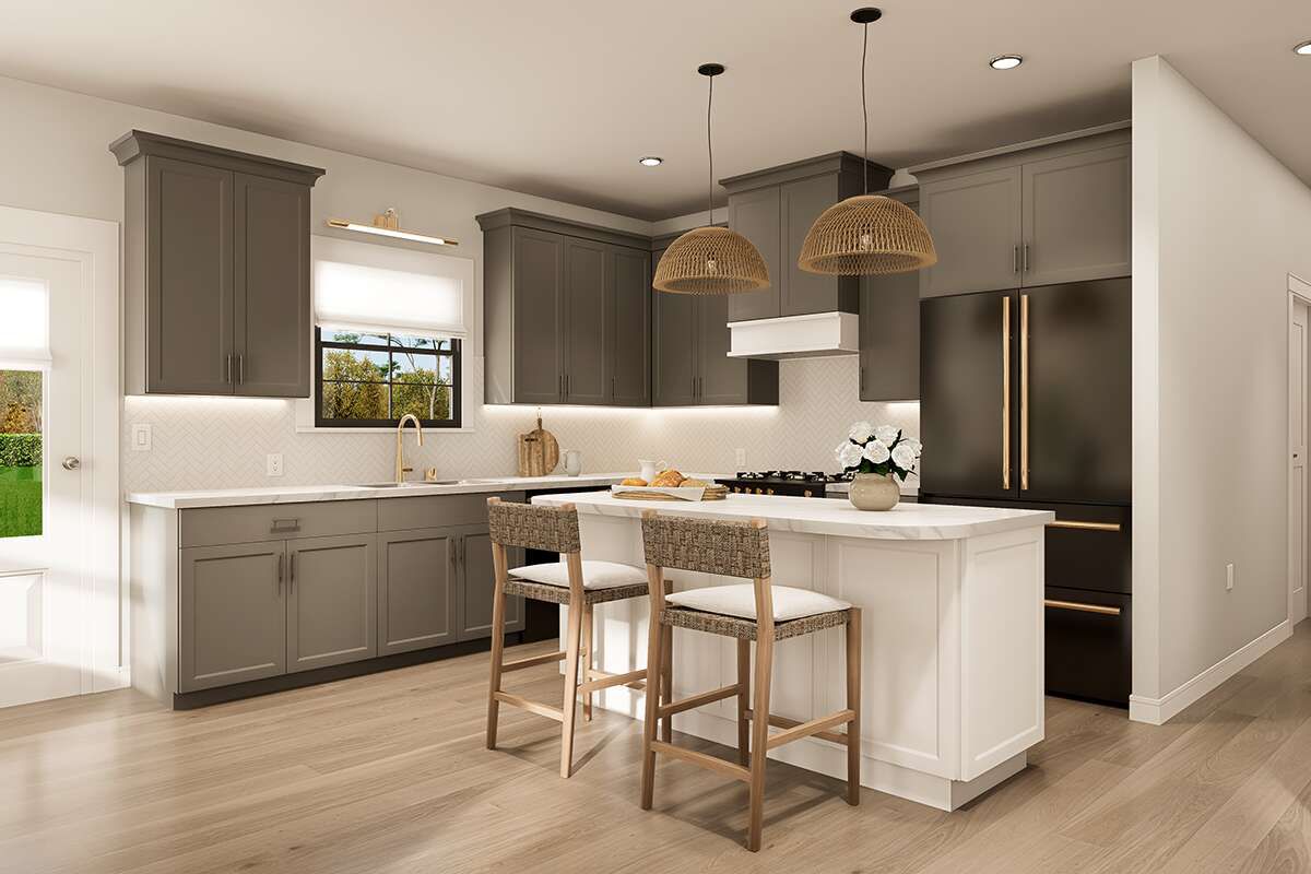 The kitchen is compact yet functional, designed with a modern work triangle that reduces steps. A central peninsula or island doubles as prep space and informal dining spot. Generous cabinetry, base drawers, and a pantry cabinet keep small appliances tucked away, leaving counters clear for cooking and serving.