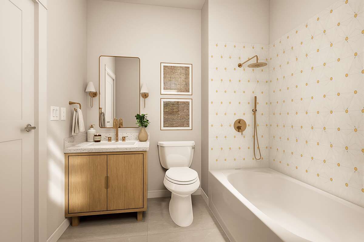 The primary bedroom sits in a private wing, with space for a queen or king bed, a dresser, and nightstands. A large closet supports organized living, while the ensuite bathroom offers a vanity, toilet, and tub/shower combination for complete convenience. This setup provides privacy from the home’s busier spaces while keeping everything accessible.