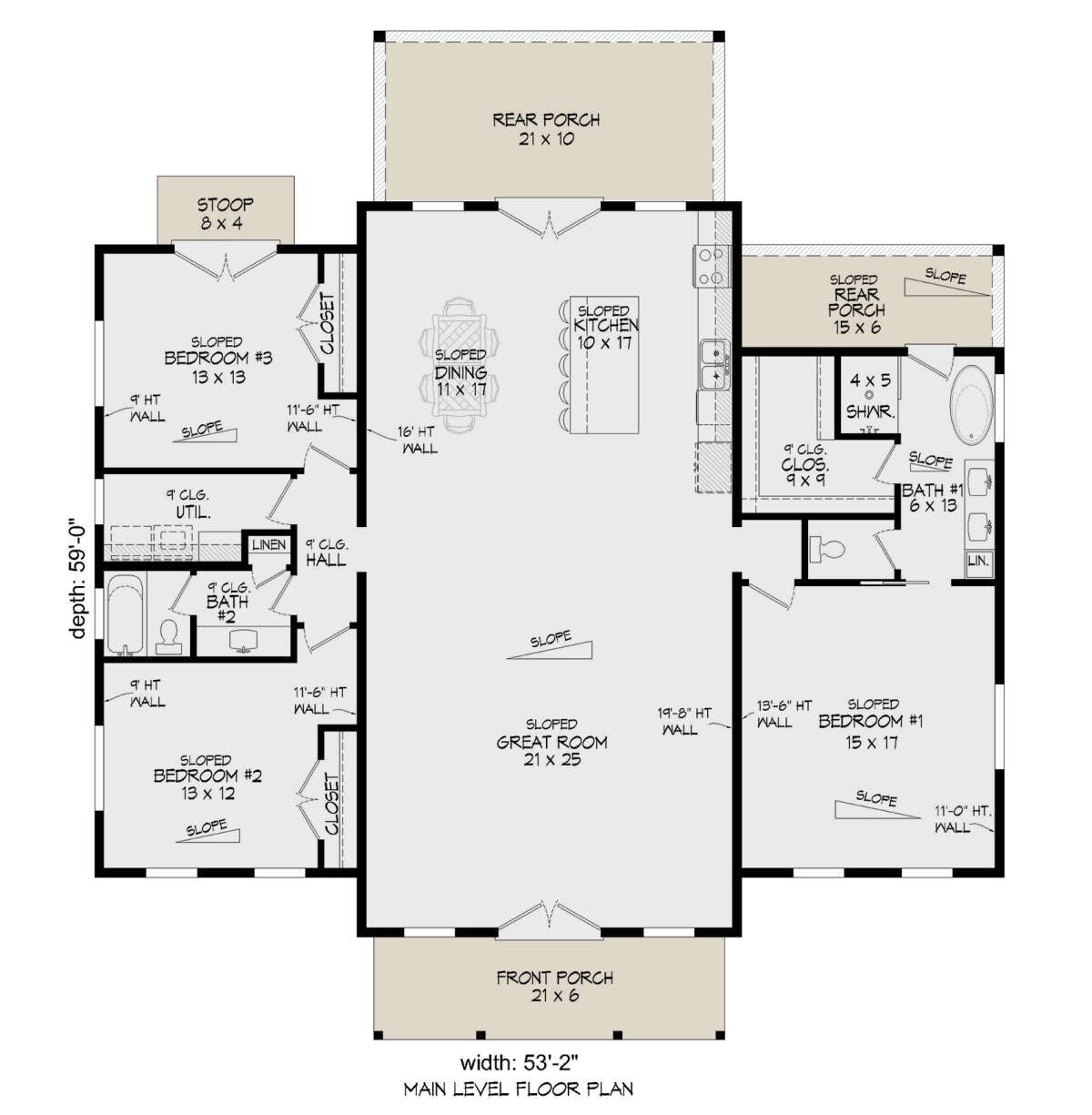 With a streamlined one-story layout, the home minimizes hallways and puts every square foot to work. A trim overall width makes it a friendly candidate for narrow or infill lots, while the modest depth helps keep site work, slab, and framing economical. Because the plan is compact and efficient, you’ll find energy performance easier to achieve: fewer exterior corners mean less thermal bridging, and a centralized kitchen/living core simplifies duct runs for better HVAC efficiency. If you’re building in a snowy climate, consider a steeper roof pitch and ice-dam protection; in hotter regions, prioritize radiant barriers and a well-ventilated attic.