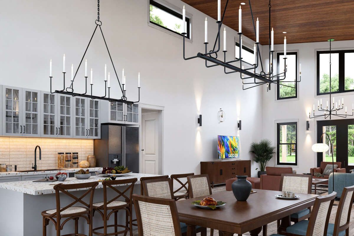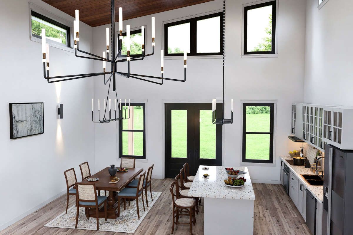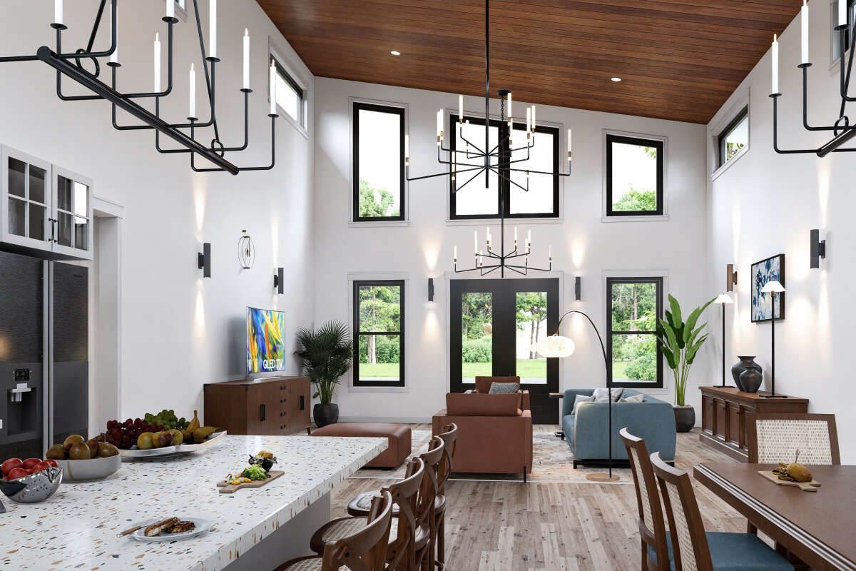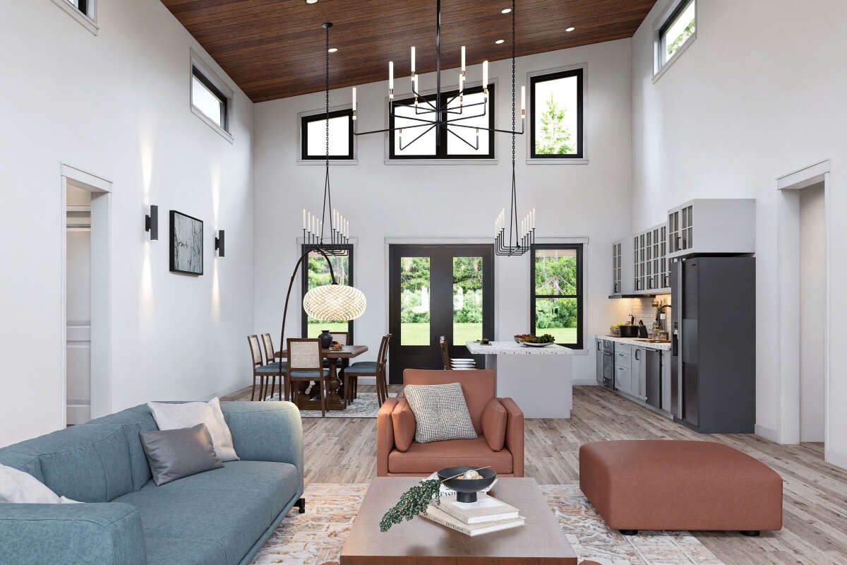 Inside, a neutral foundation—soft whites, warm greiges, or sandy taupes—lets the natural light sing and makes rooms feel larger. Layer in texture with LVP or hardwood floors, woven window shades, and a few wood accents. In the kitchen, shaker cabinets pair well with cottage style, while slab doors push modern. Matte black or warm brass hardware adds polish without overpowering a small space. Because this plan lives open, repeat a few finishes (pendant metals, cabinet tones, or backsplash tile) from room to room to create cohesion and visual calm.