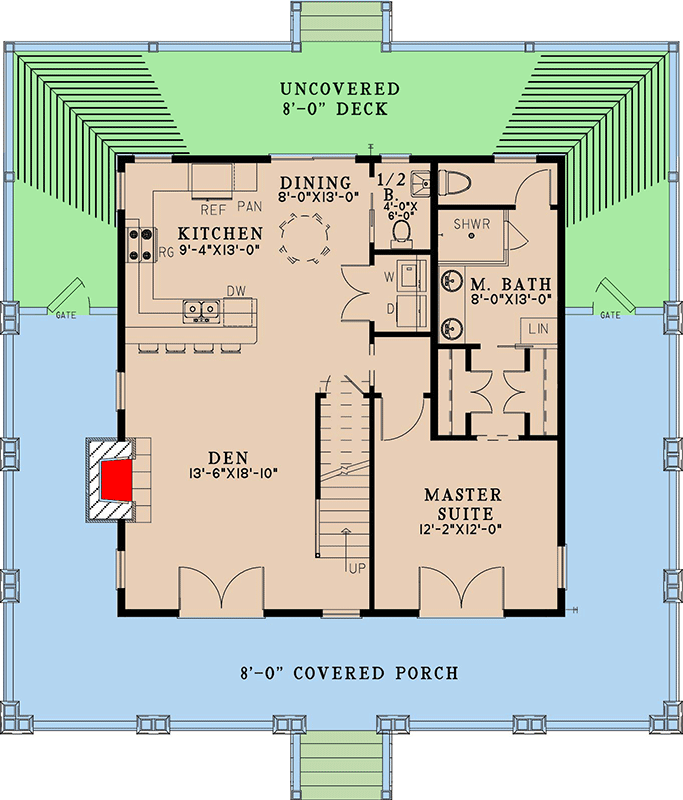 The master suite sits on the main floor and benefits from direct access to the porch, making it feel like a private retreat. 7 It includes space for a full bed, seating, and thoughtful closet capacity. The master bath and half bath are placed for both privacy and guest access.