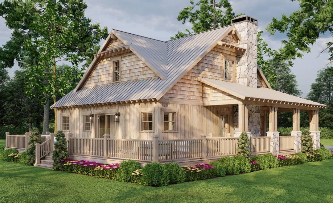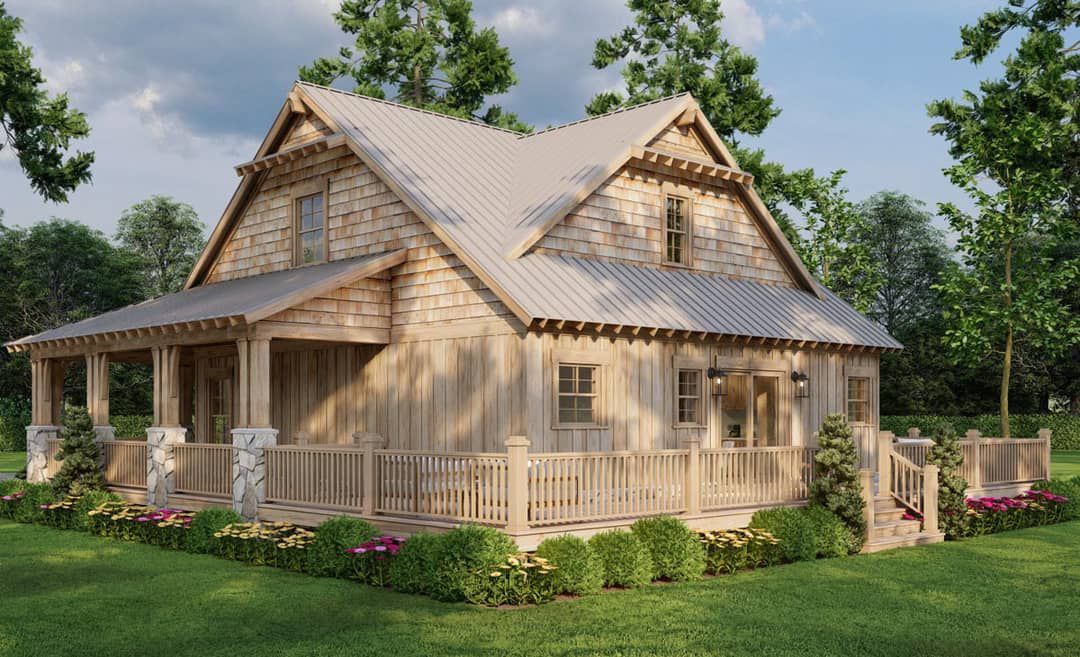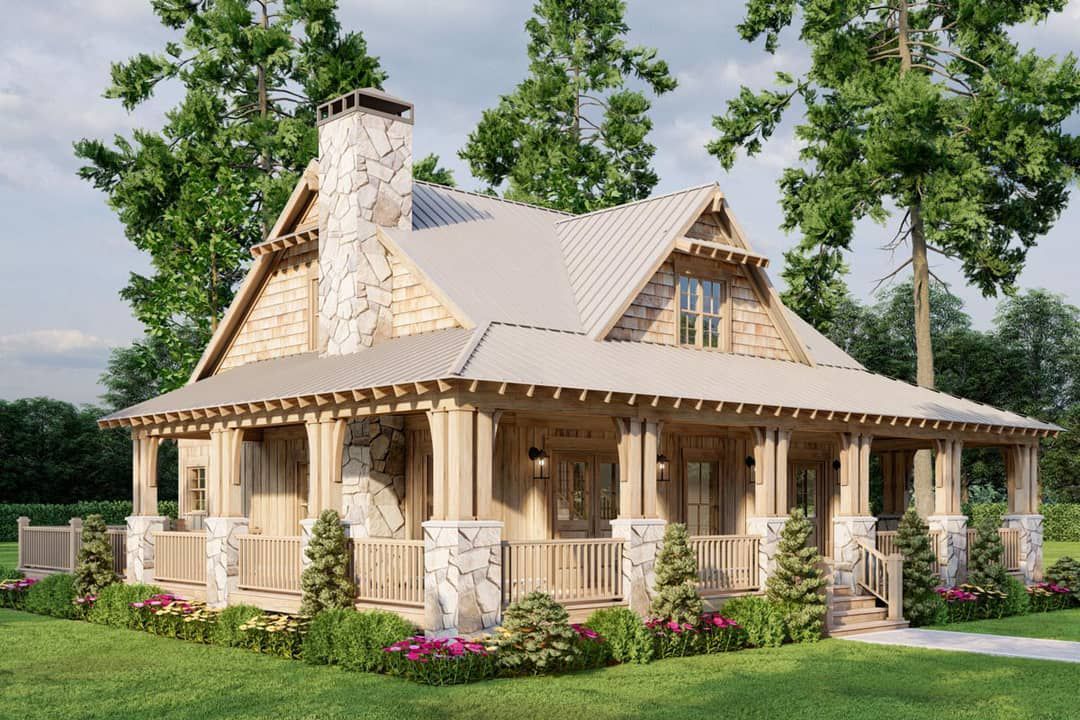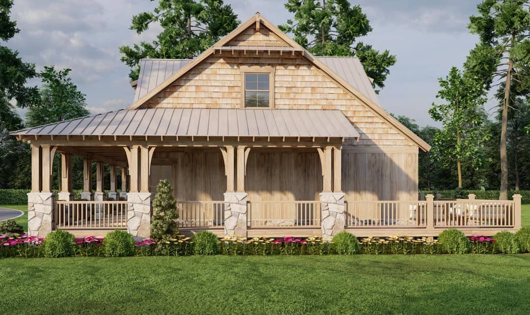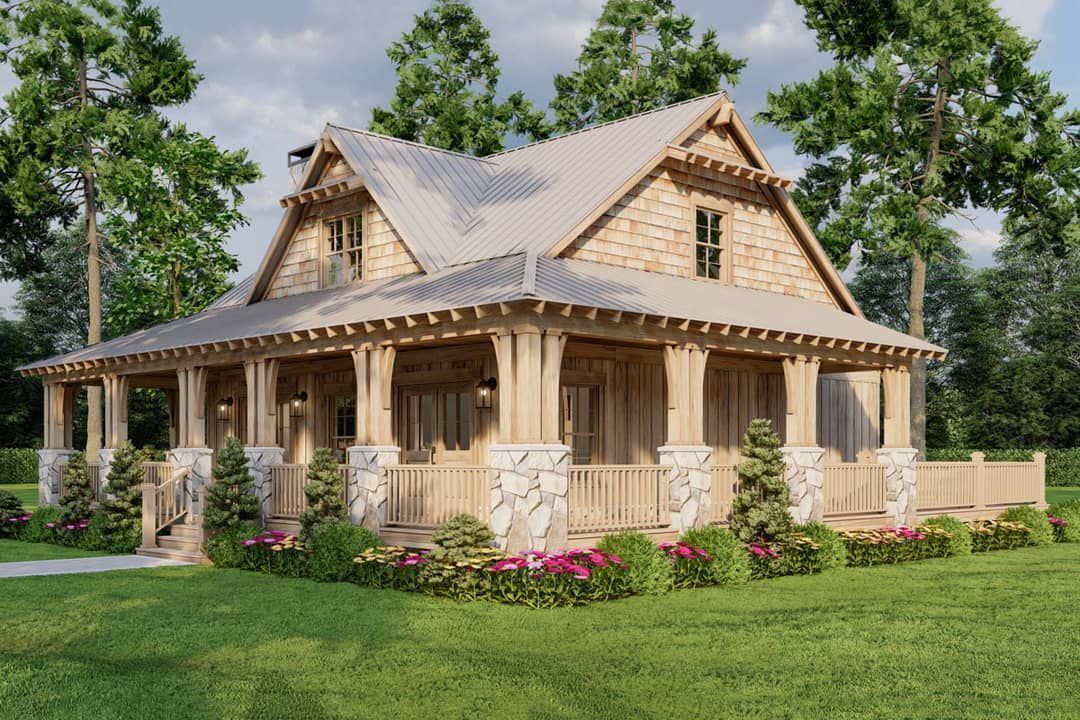 The home is defined by an 8-foot deep porch that wraps around all four sides, with covered frontage and open deck space at the rear—creating a total of 733 square feet of outdoor platform to enjoy. 0 A mix of rustic siding, stone accent columns, and large windows complements the landscape with organic character. The roofline features primary and secondary pitches (9:12 and 5:12), giving visual interest while remaining straightforward in framing. 1