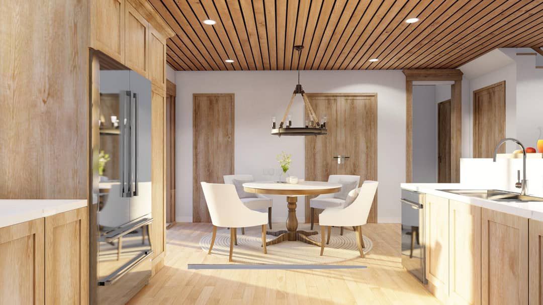 The C-shaped kitchen is both functional and social. Peninsula seating invites casual meals or interactions while cooking, while cabinet depth and layout prioritize workspace efficiency. The plan places the kitchen near the rear deck, allowing direct access for outdoor dining and entertaining. 8