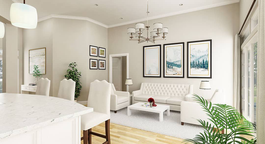 The great room is scaled for modern living: sectional seating, lounge chairs, media wall, and decorative elements all find place. Traffic moves around the edges, so the seating zone remains undisturbed. Large windows and porch doors enhance indoor-outdoor synergy.