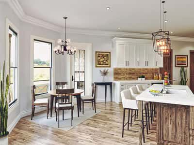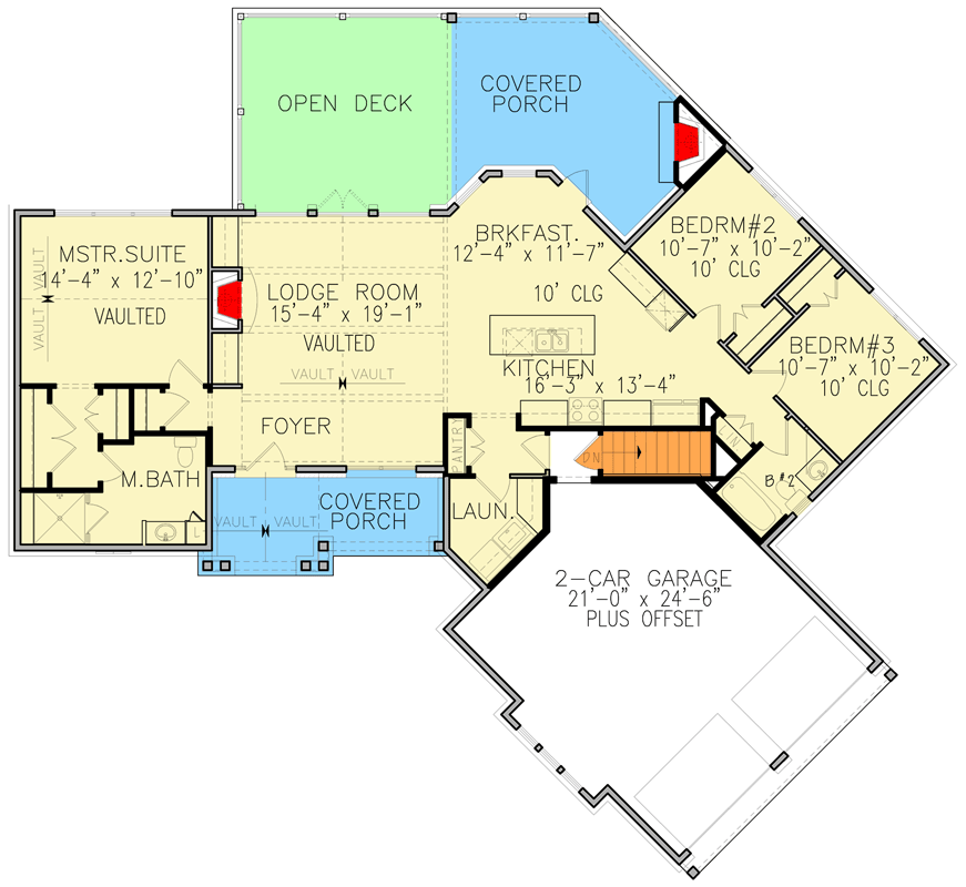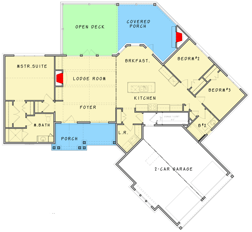 French doors from the lodge room and the breakfast nook open to a rear deck or covered porch, seamlessly connecting indoor and outdoor living. The kitchen and breakfast spaces remain efficient but open to view and action. 3