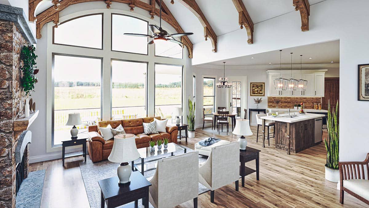 You enter through the vaulted covered porch into a warm lodge room, where vaulted ceilings and open lines invite the eye toward the back. The living, dining, and kitchen zones all flow together under that open ceiling, giving a sense of spaciousness. 2