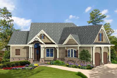 The façade features classic Craftsman elements—gabled roofs, tapered columns, exposed rafters, and mixed materials like siding and stone bases. The angled garage breaks the monotony and provides a subtle asymmetry that feels custom and intentional. A vaulted covered front porch welcomes you in while framing the home’s proportions neatly. 0