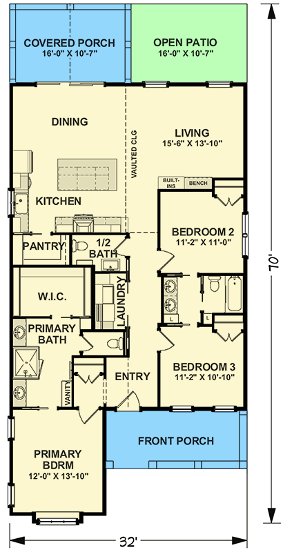 At 32′ wide by 69′ deep, the footprint is compact yet respectable. The roof is framed with trusses and slopes at 9 on 12 to give presence without excessive height. 2
