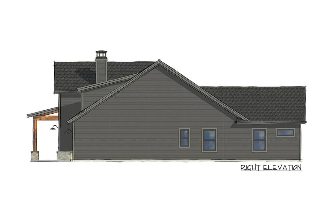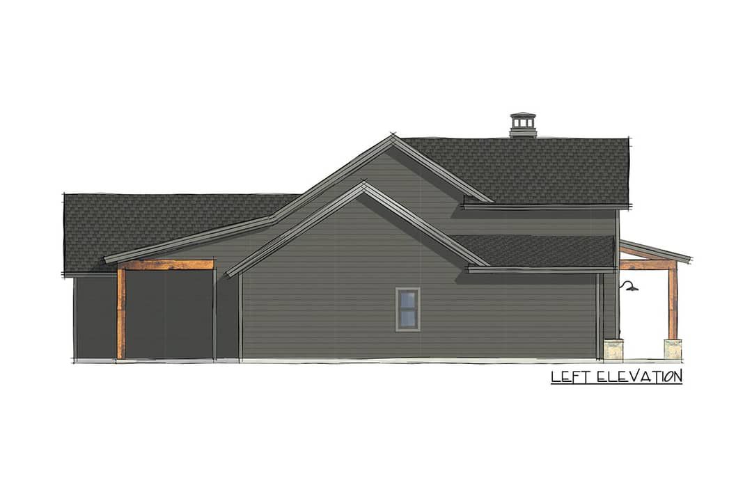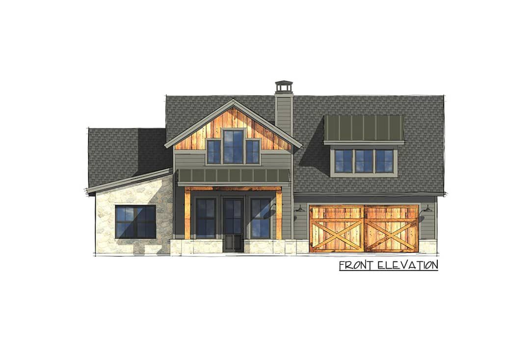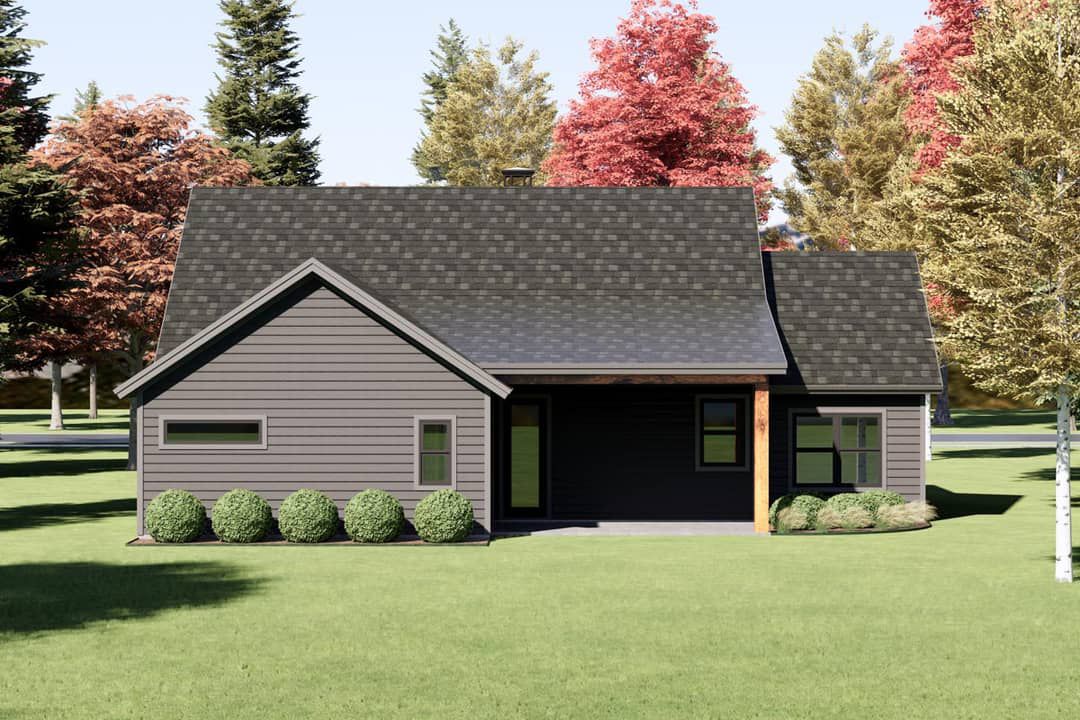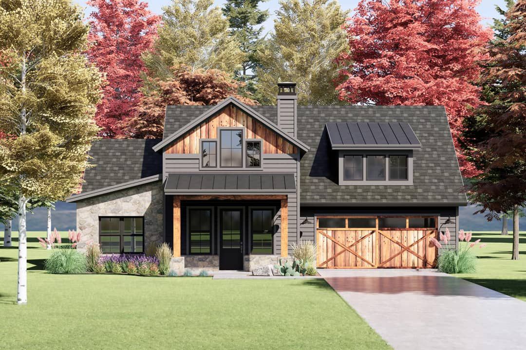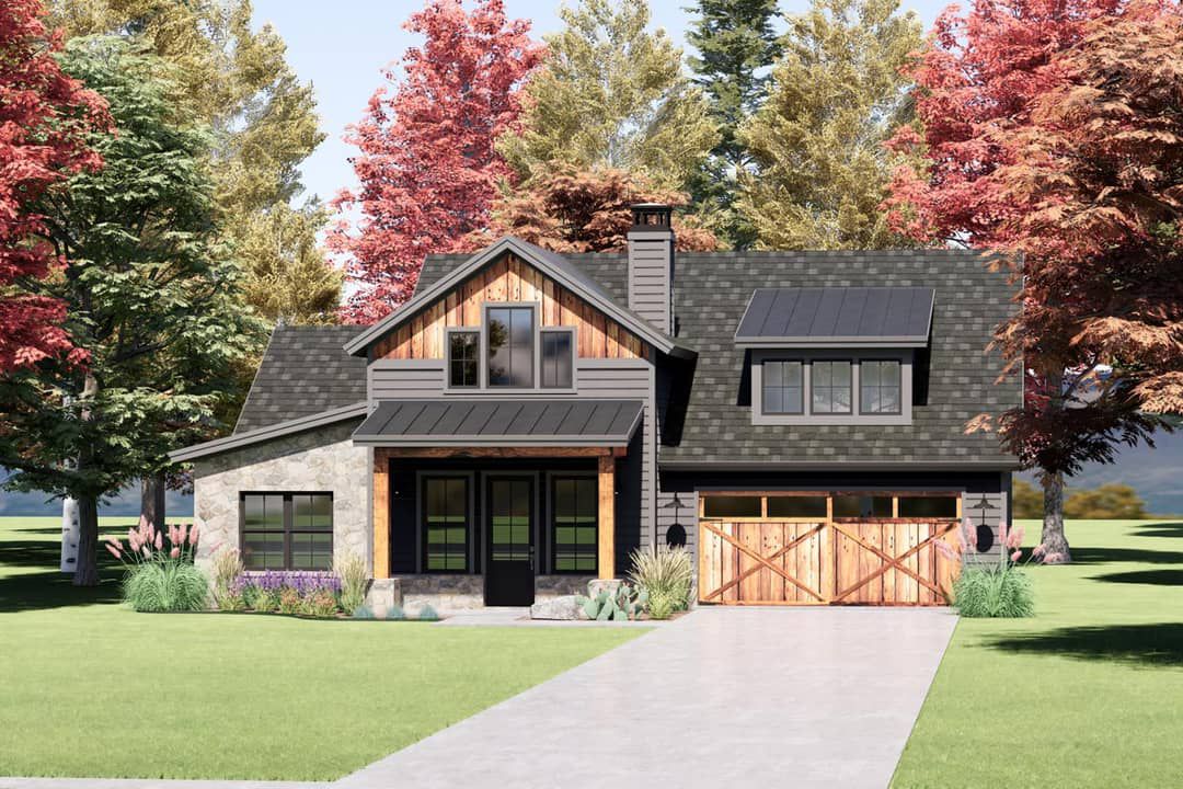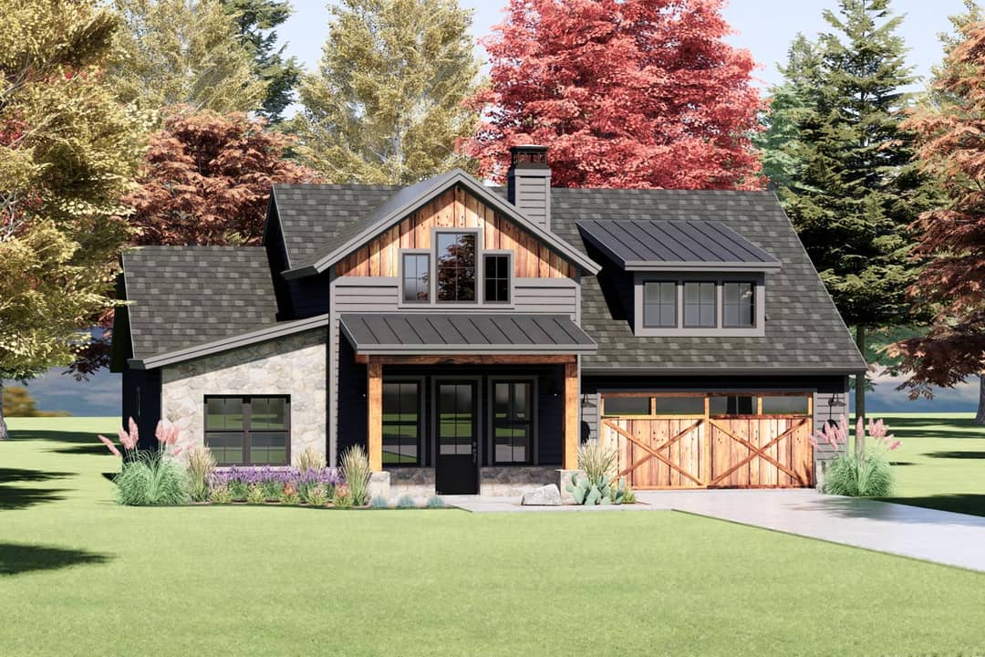 The façade combines rustic farmhouse touches with modern sensibility. A front porch (about 15′2″ × 6′ deep) invites entry and frames the front. 1 Timber posts, stone bases, and vertical siding details reinforce the rural character. The roofline includes gables and moderate pitches (8:12 primary, 3:12 secondary) to add dimension without complexity. 2