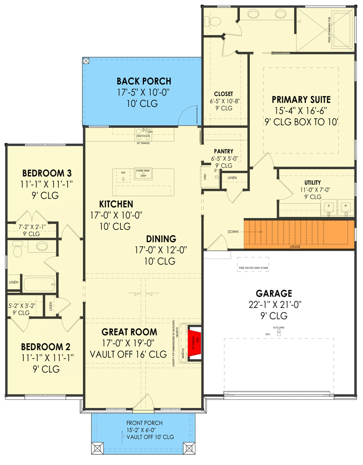 Exterior walls use 2×4 construction by base specification, with optional upgrade to 2×6 for better thermal performance. 20 Ceilings throughout are 9 feet, giving volume without excess. 21 Roof framing follows a stick construction pattern with primary 8:12 pitches and secondary 3:12 slopes. 22
