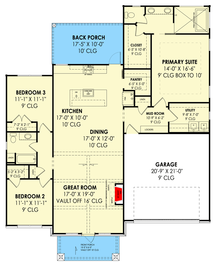The split-bedroom arrangement separates the master suite on one side (near the garage) from the secondary bedrooms on the opposite wing. Bedrooms 2 and 3 share a full bath between them. 7 Circulation is minimized, so most square footage goes to rooms rather than hallways.