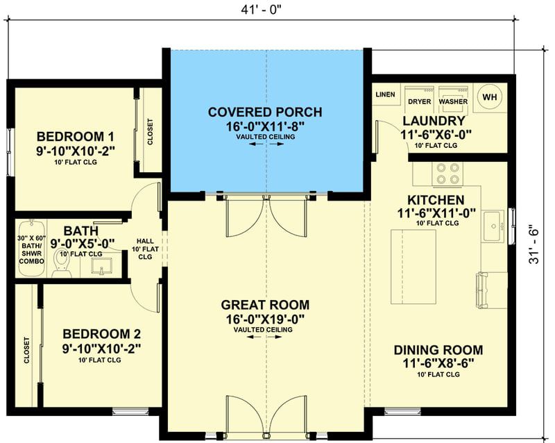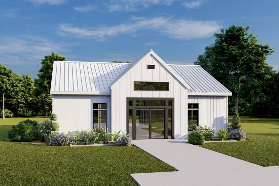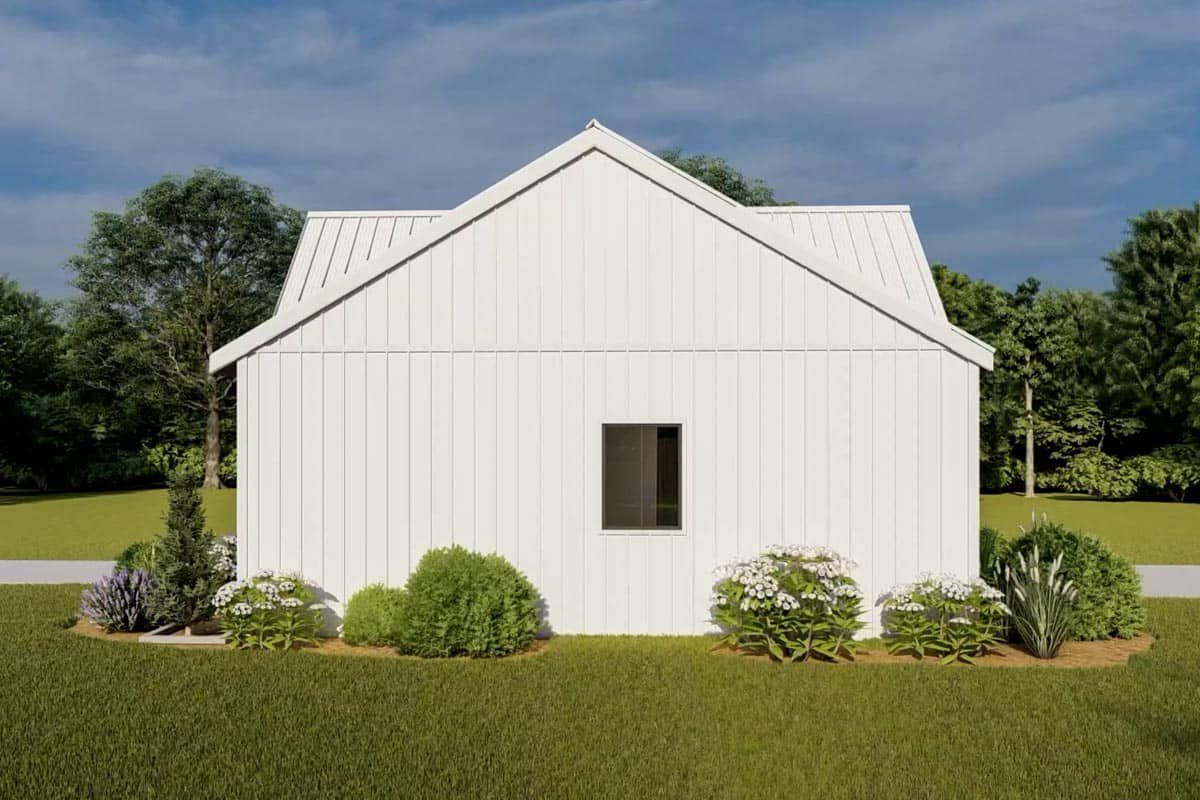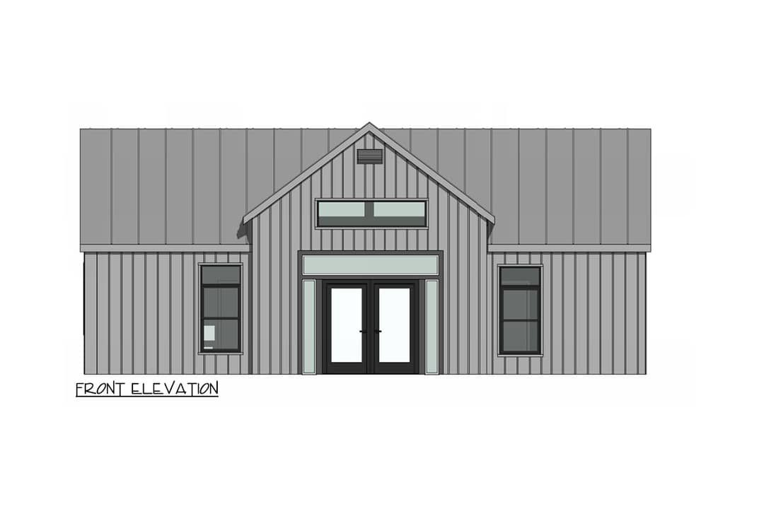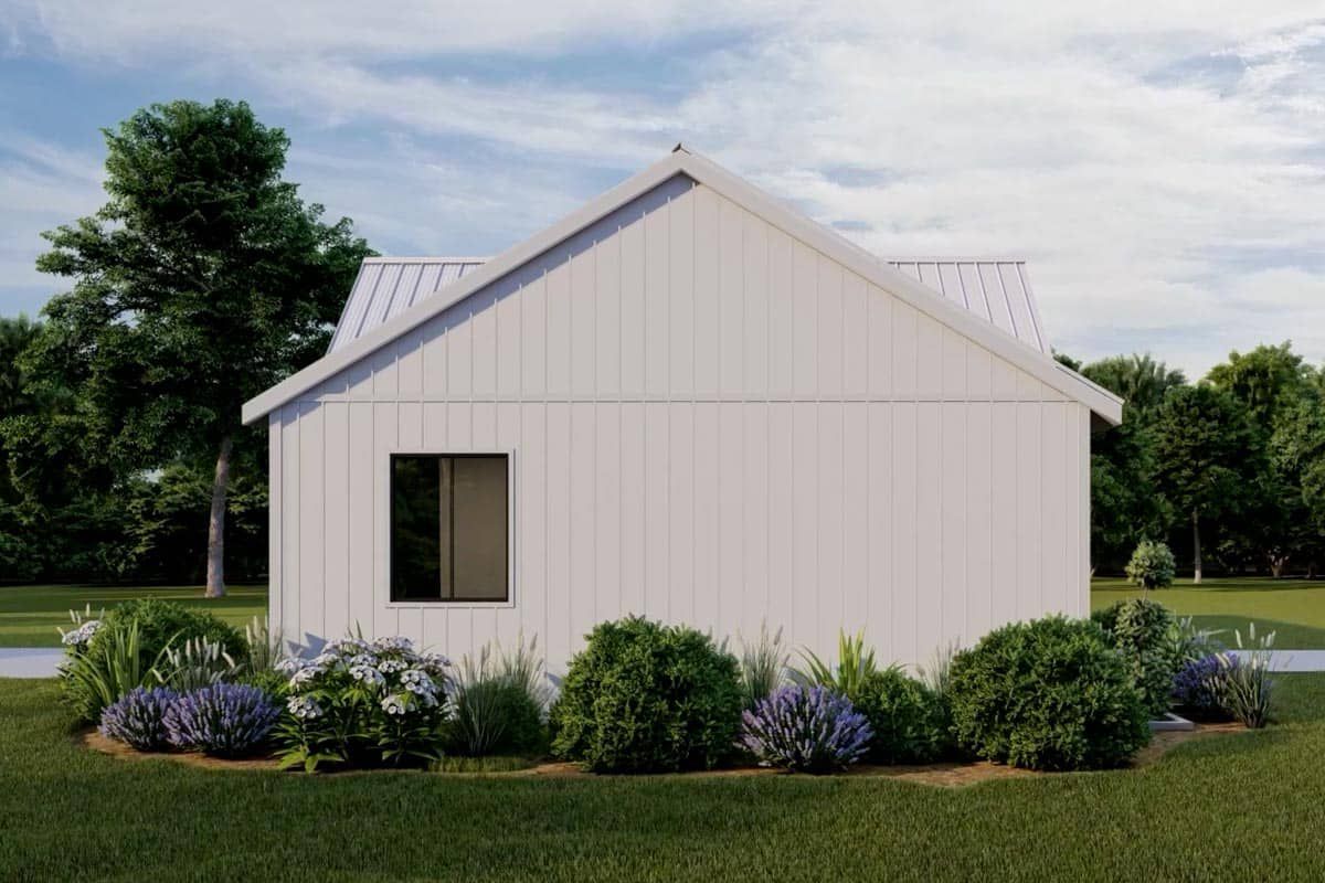 The exterior combines clean lines and minimal detailing with a modern cottage sensibility. Vertical board-and-batten siding, a gently pitched gabled roof, and modest overhangs maintain simplicity. A rear covered porch is vaulted to echo the interior volume. According to plan specs, overall dimensions are about 41′ wide by 31′6″ deep. ([turn0view0])