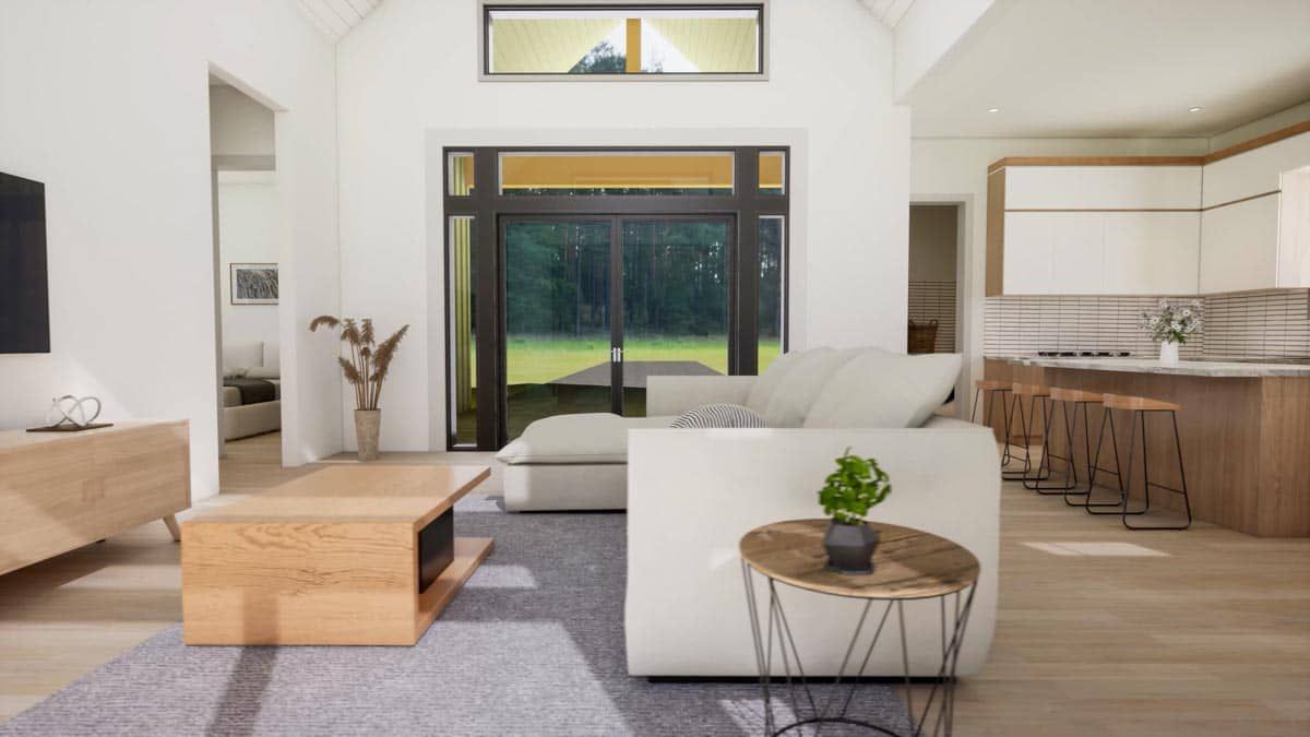 The dining zone shares this open space and connects to the rear porch via sliding doors or wide openings. This makes meal transitions and entertaining feel effortless. Light filters in through the glass, reinforcing the sense of extension outdoors.