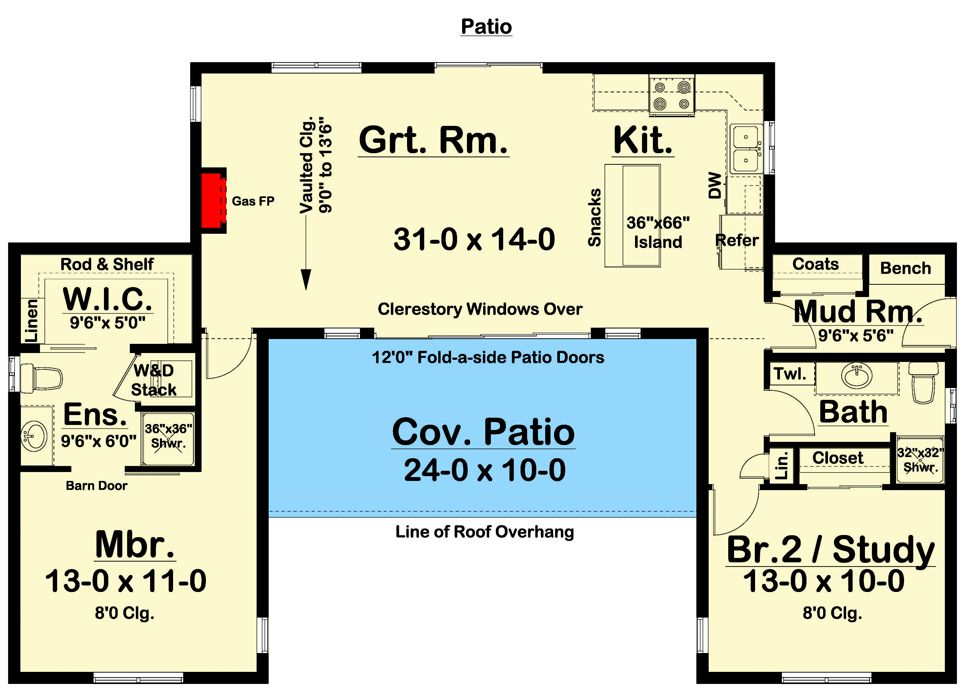 The 10′ deep covered front patio frames the entry and becomes a living extension—ideal for seating or greeting guests. 15