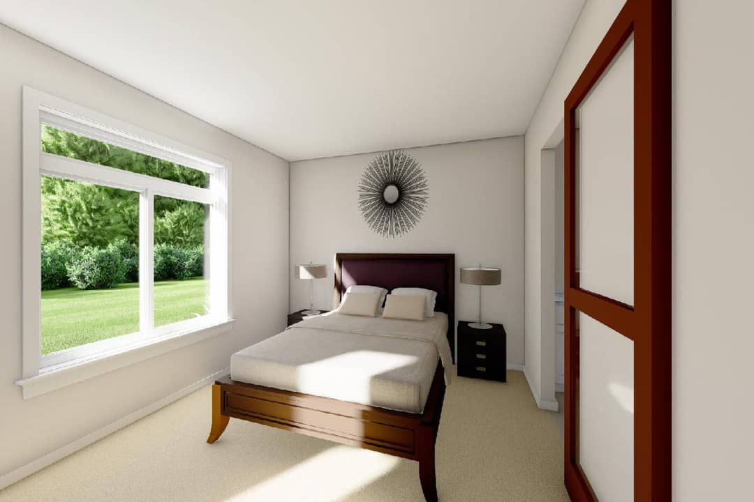 To the left wing lies the master suite, complete with its own full bathroom and even laundry access built into the suite. 6 On the right wing is a flex room that can serve as a bedroom or study, paired with a second full bath and a mudroom zone. 7 The split arrangement ensures privacy and comfort while maintaining a compact footprint. 8