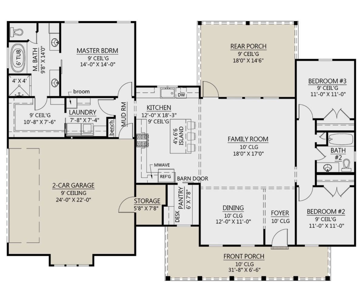 The exterior is striking: vertical board-and-batten siding meets horizontal lap siding in a tasteful blend of textures. The front porch spans about 31′ in width and is 6′ deep with a 10′ ceiling, creating a gracious entry. 1A rear covered porch (roughly 14′ × 18′) with 9′ ceiling extends the living outdoors without overextending the footprint. 2