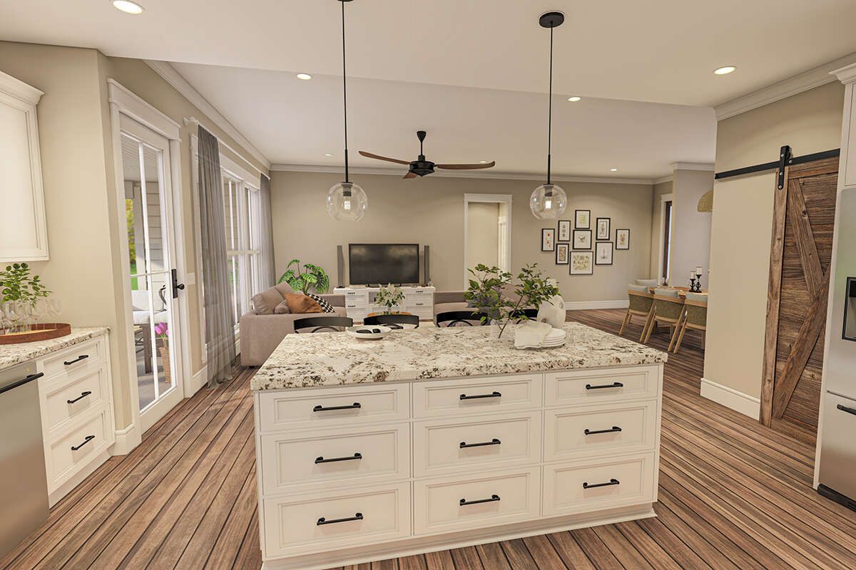 The kitchen is both beautiful and practical: the island supports prep and casual seating, while the walk-in pantry behind barn doors keeps clutter hidden. 11Counter and cabinet layouts maximize utility. The design maintains connection to living and dining so the cook doesn’t feel isolated. 12
