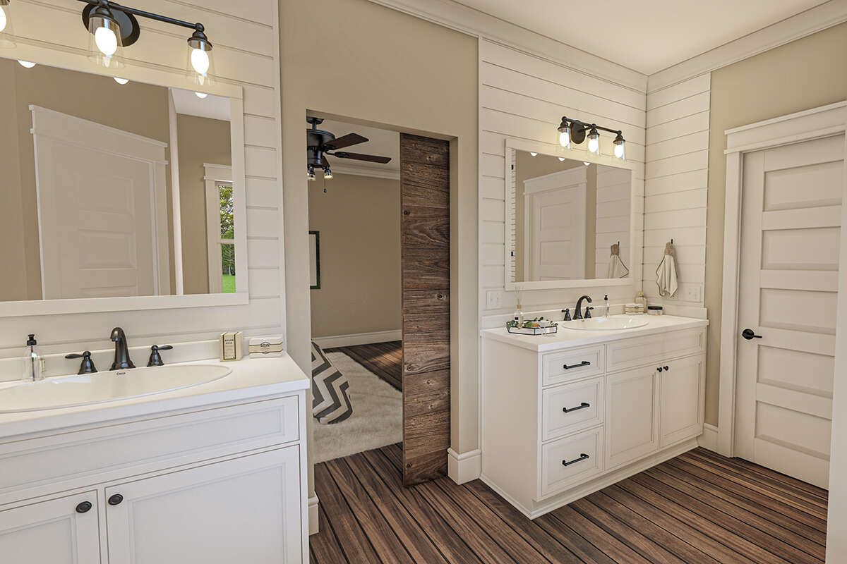 Entry from the front porch leads into a 10′ ceiling foyer that flows into the open dining area and great room beyond. The great room is vaulted and becomes the visual and functional heart. 4The kitchen is adjacent to dining, featuring an island, window over the sink, and a walk-in pantry hidden behind barn doors. It maintains sightlines into the living zones and access to the rear porch. 5The split-bedroom layout places the owner’s retreat on one side and the two secondary bedrooms on the opposite wing, ensuring privacy and balance. 6