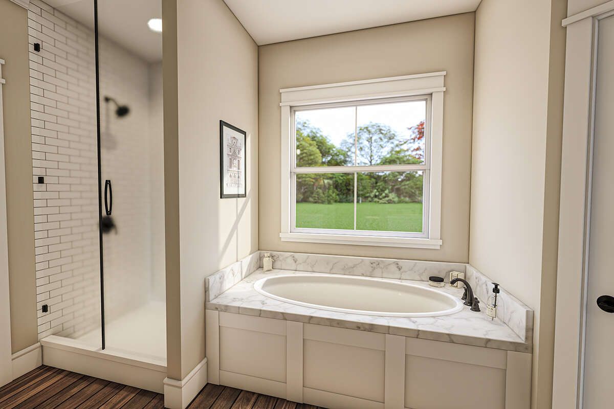The exterior framing is 2×4 by default, with a paid option to convert to 2×6 walls for better insulation. 17The roof pitch and simple geometry keep structure straightforward. Wet zones (kitchen, baths, laundry) are clustered to reduce plumbing run lengths. Overhangs help shield glazing from direct sunlight. 18