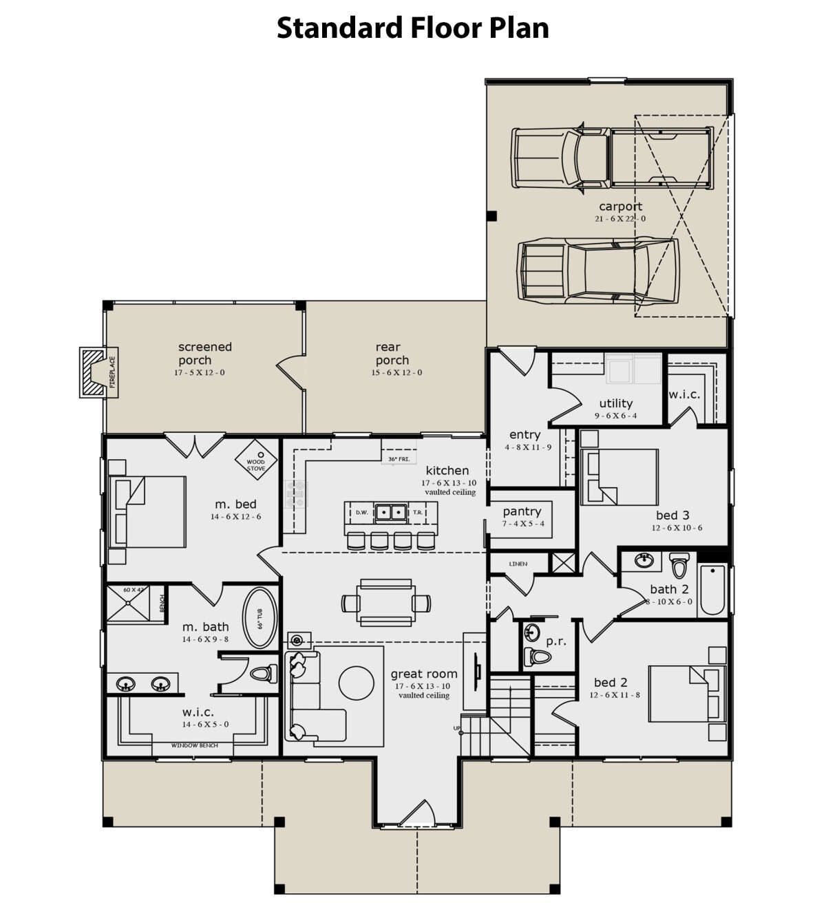 Entry from the porch leads into a foyer opening toward the vaulted great room, which connects to dining and kitchen. Vaulted ceilings in the core spaces lend volume and drama. 5 The layout supports entertaining while preserving cozy scale.