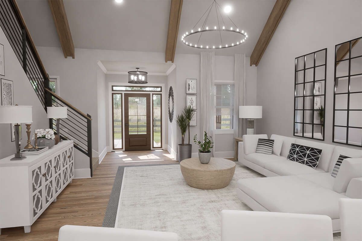 Entry from the porch leads into a foyer opening toward the vaulted great room, which connects to dining and kitchen. Vaulted ceilings in the core spaces lend volume and drama. 5 The layout supports entertaining while preserving cozy scale.