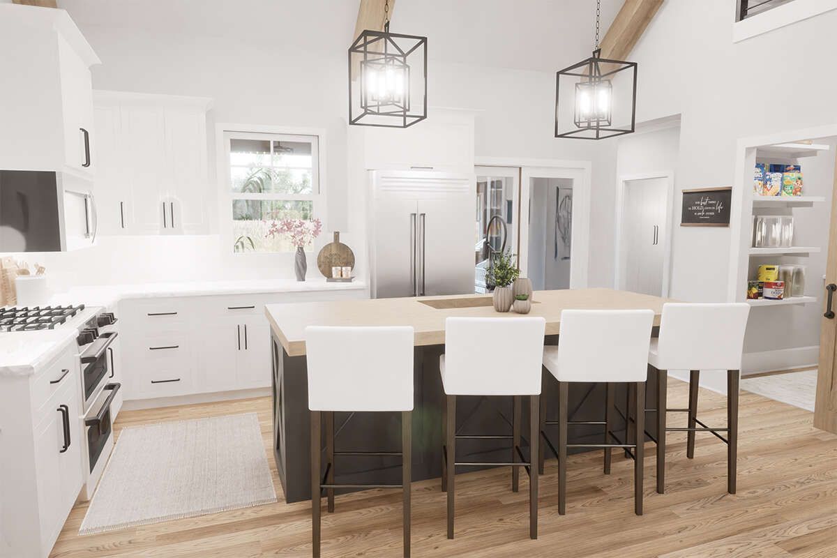 The kitchen is roomy, with a central island facing the dining/great room so the cook stays engaged. 13 Counter and cabinet layouts optimize workflow. A walk-in pantry and storage zones support daily needs. 14