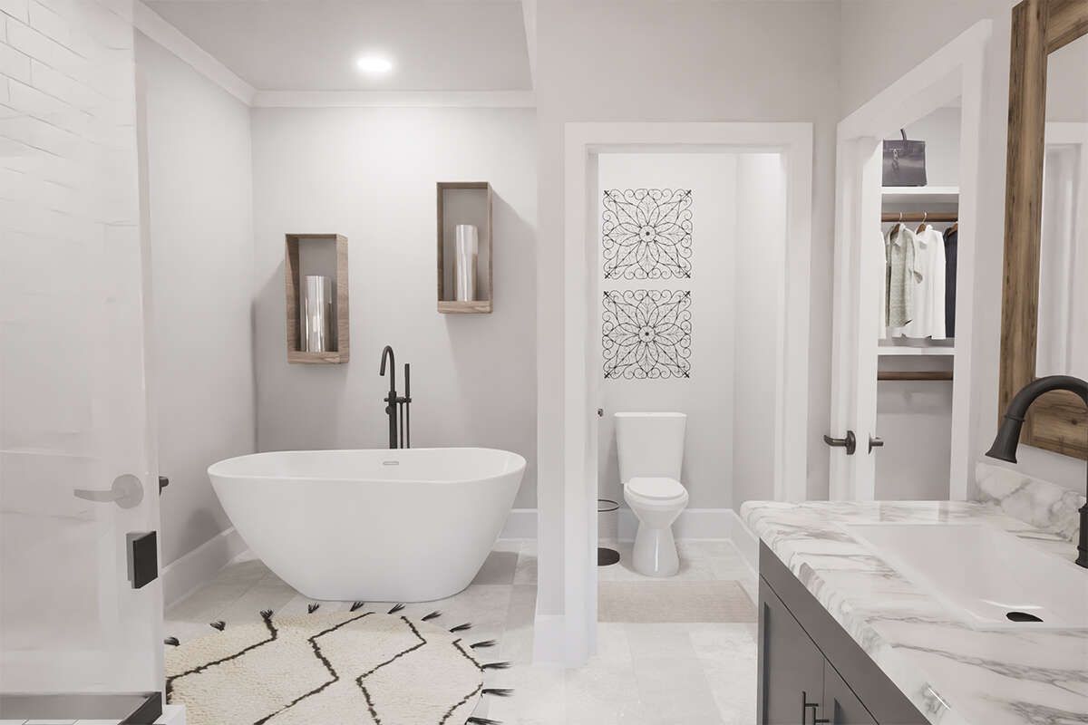 The master suite features a luxurious bath with dual vanities, a separate tub and shower, a compartmentalized toilet, and a large walk-in closet. 8 It even has private access to the screened porch. 9